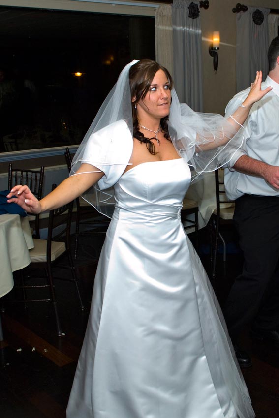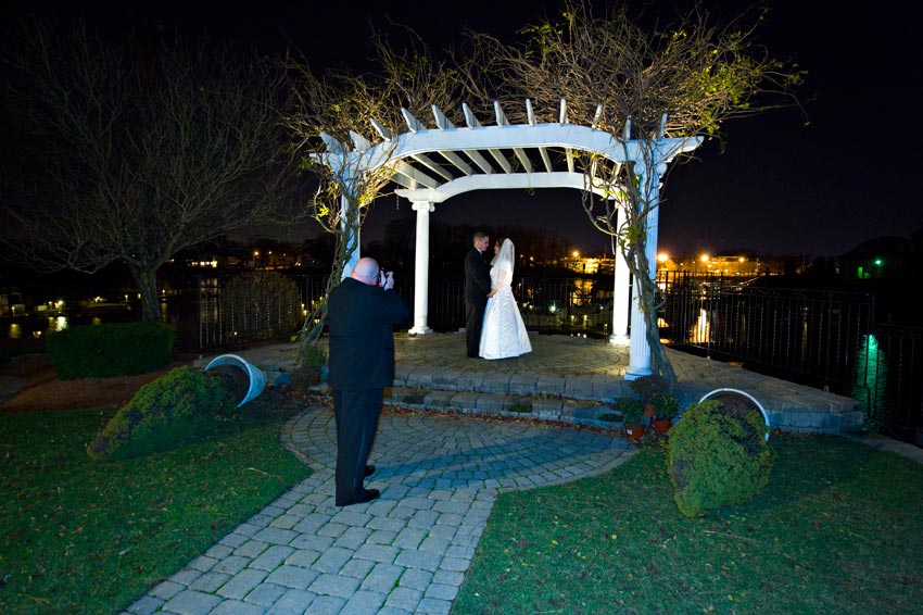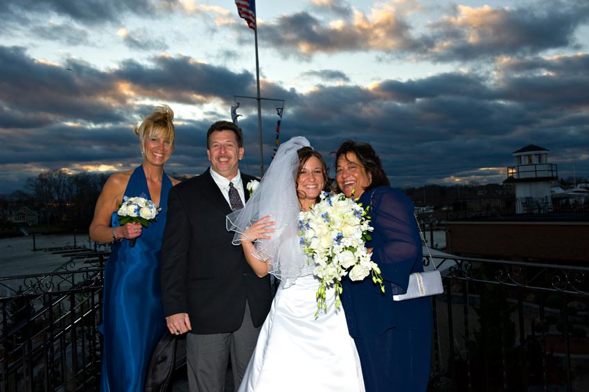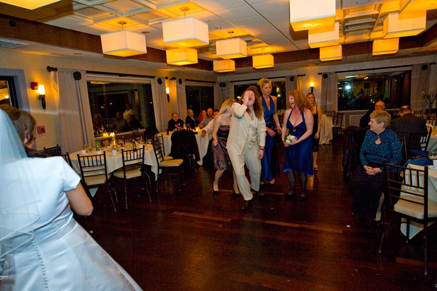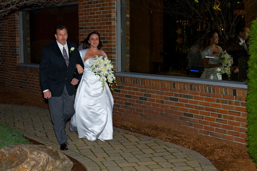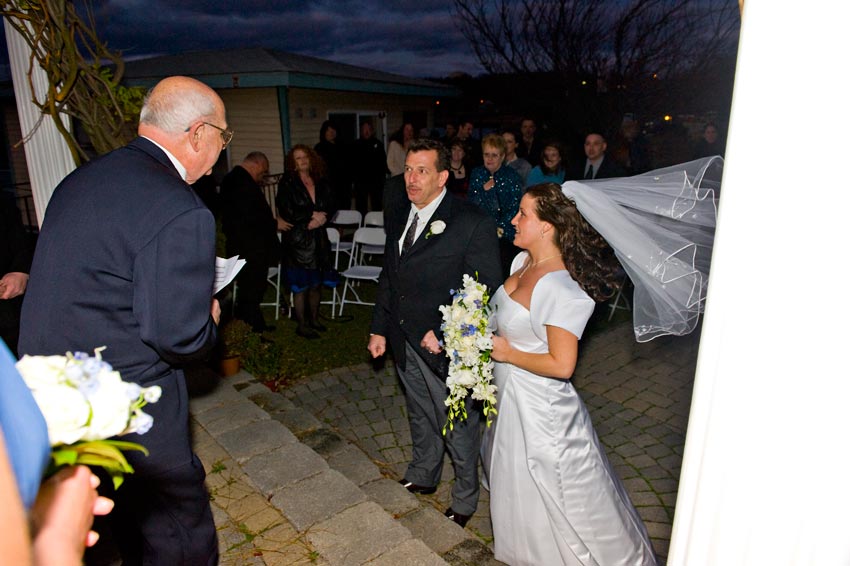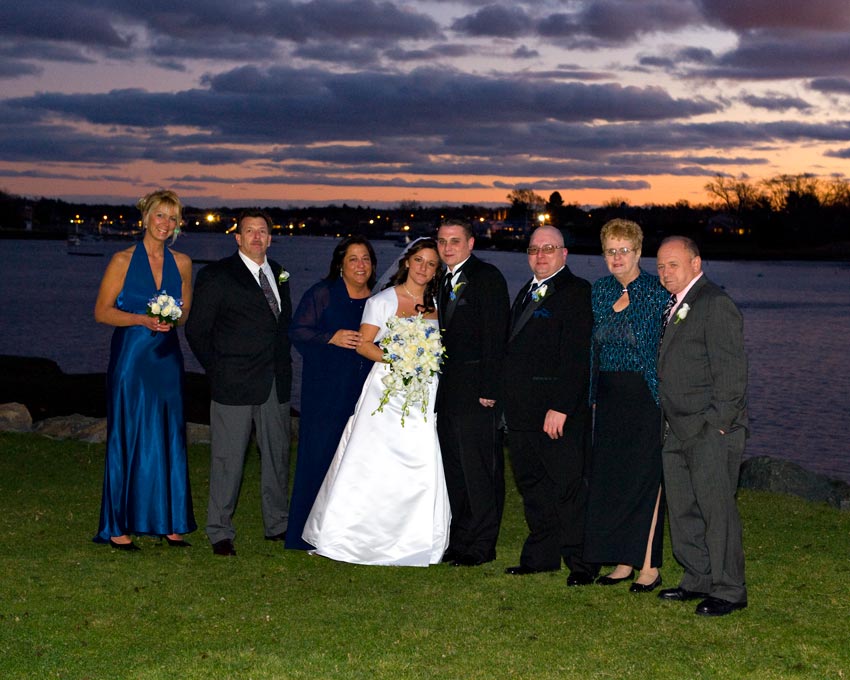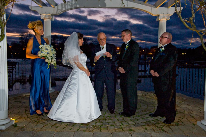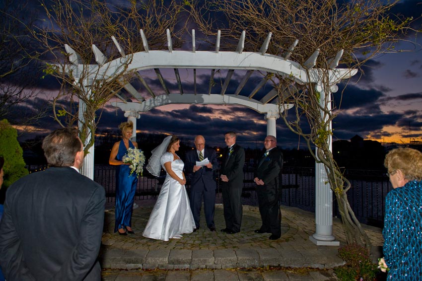 The ceremony started half an hour after sunset. The temperature was in the upper 30's, and the wind was blowing at 25 to 30 miles per hour, giving a wind-chill factor approaching zero. The ceremony seemed quite long to me (it lasted seven and a half minutes), and afterwards the formals were done outside on the lawn by the Gazebo. It took three minutes to walk there and get set up, then all the formals were done in 12 minutes. I had a parka over three layers of clothing, and I was cold. I have no idea how they stood it, but they did, and smiled, too. Once we were in out of the cold, it was a fun wedding (except for the guest that tried to catch the bouquet with her face).