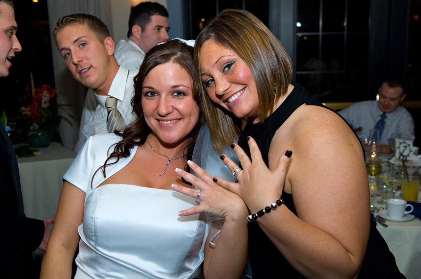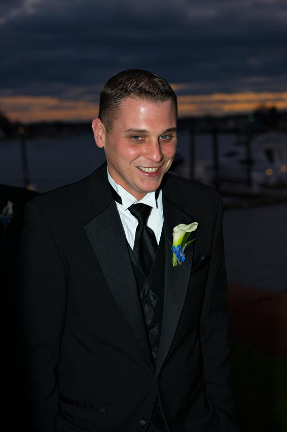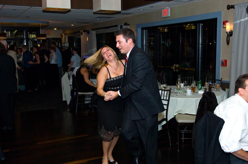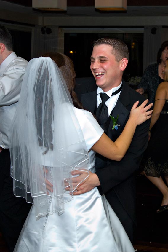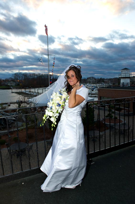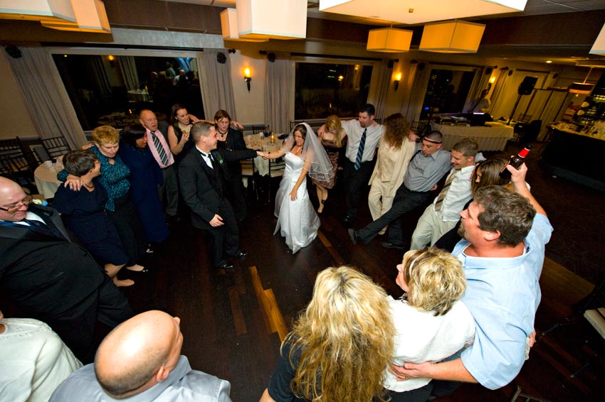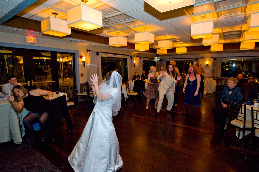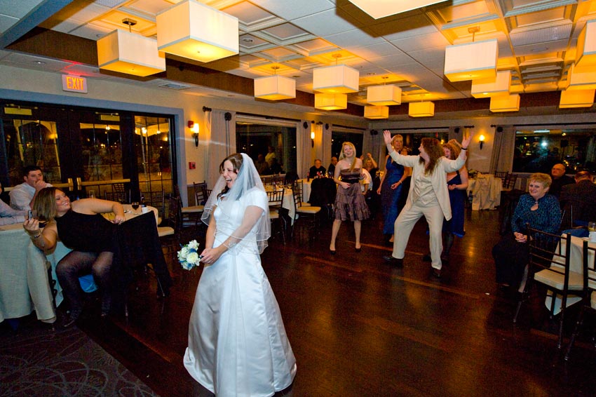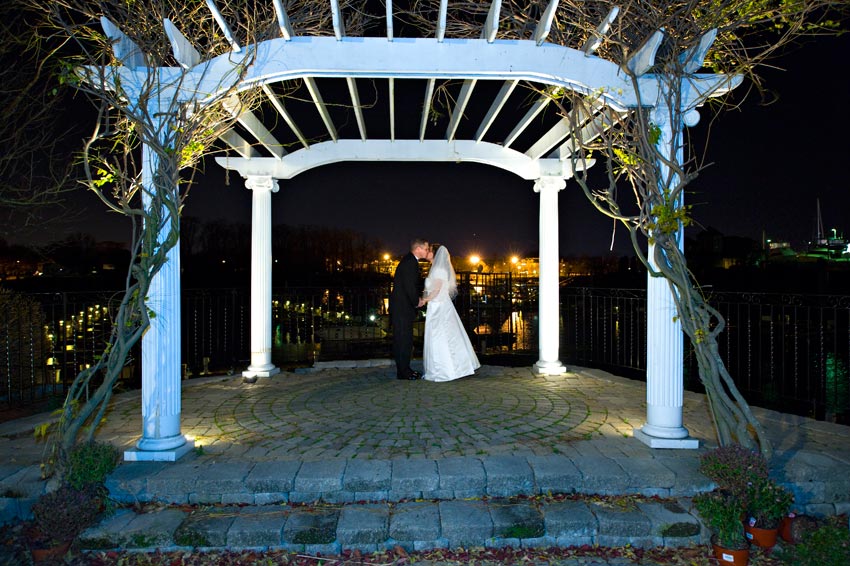 The ceremony started half an hour after sunset. The temperature was in the upper 30's, and the wind was blowing at 25 to 30 miles per hour, giving a wind-chill factor approaching zero. The ceremony seemed quite long to me (it lasted seven and a half minutes), and afterwards the formals were done outside on the lawn by the Gazebo. It took three minutes to walk there and get set up, then all the formals were done in 12 minutes. I had a parka over three layers of clothing, and I was cold. I have no idea how they stood it, but they did, and smiled, too. Once we were in out of the cold, it was a fun wedding (except for the guest that tried to catch the bouquet with her face).
