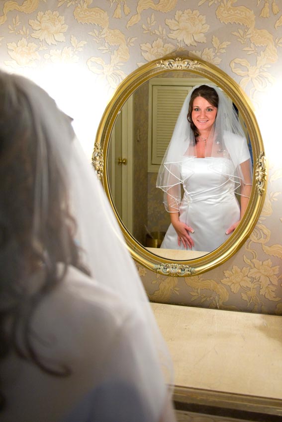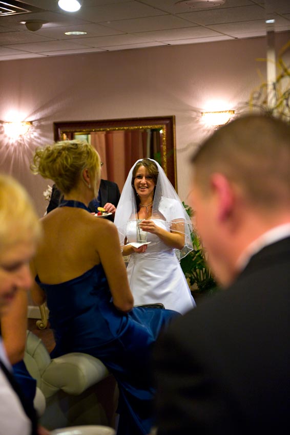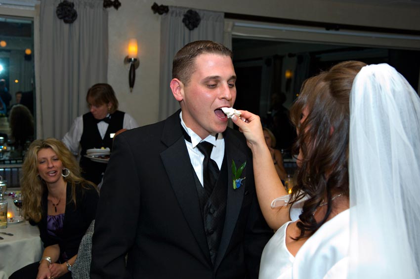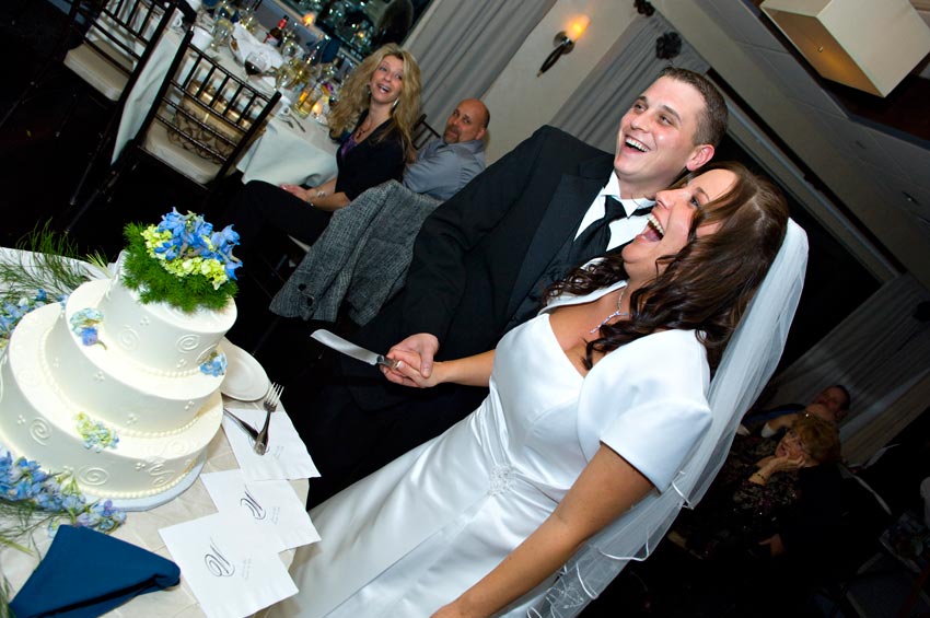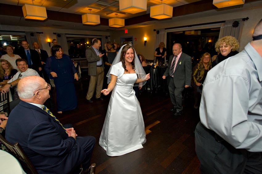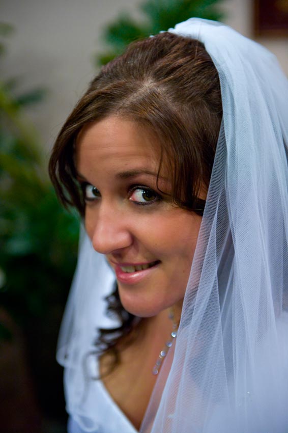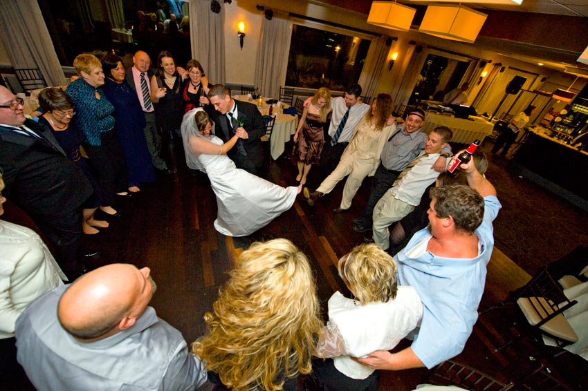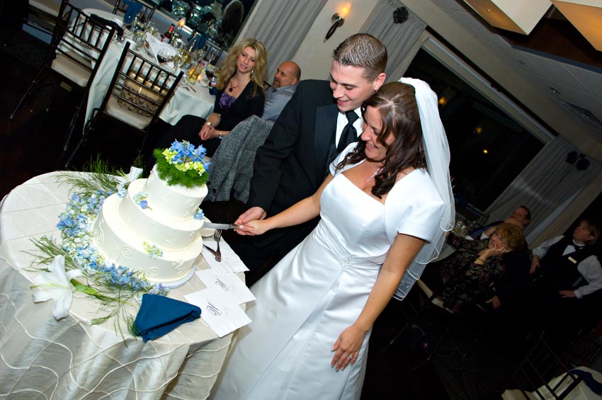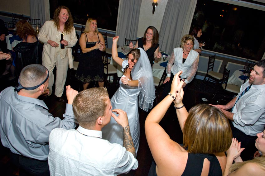 The ceremony started half an hour after sunset. The temperature was in the upper 30's, and the wind was blowing at 25 to 30 miles per hour, giving a wind-chill factor approaching zero. The ceremony seemed quite long to me (it lasted seven and a half minutes), and afterwards the formals were done outside on the lawn by the Gazebo. It took three minutes to walk there and get set up, then all the formals were done in 12 minutes. I had a parka over three layers of clothing, and I was cold. I have no idea how they stood it, but they did, and smiled, too. Once we were in out of the cold, it was a fun wedding (except for the guest that tried to catch the bouquet with her face).