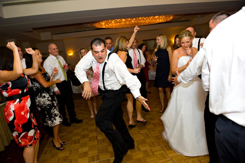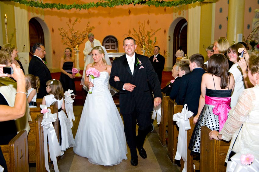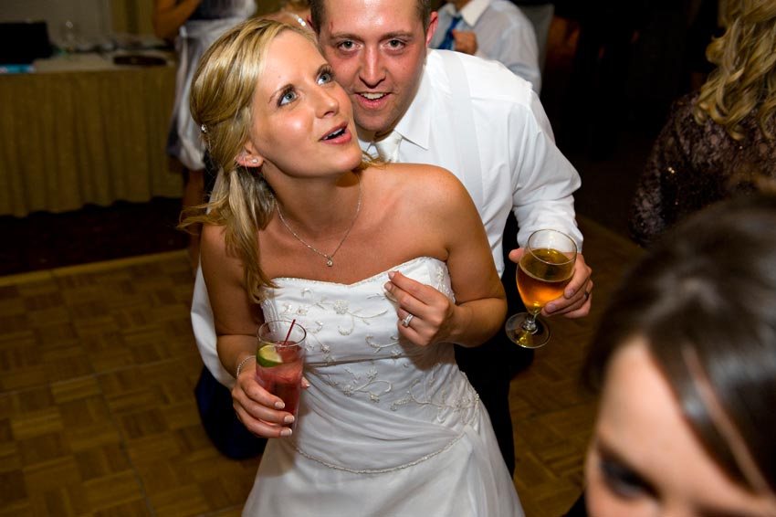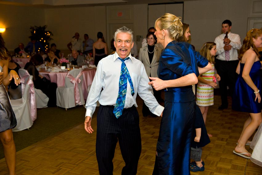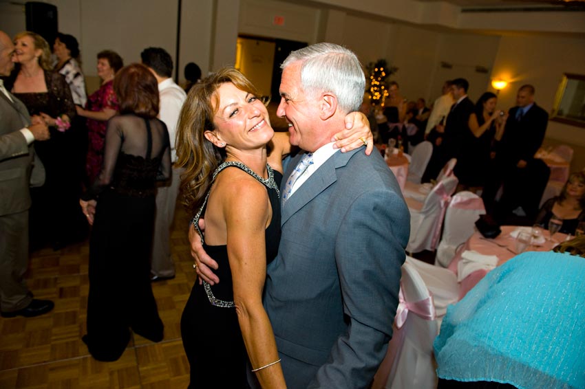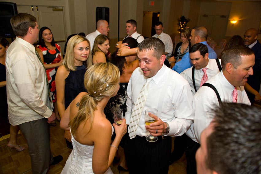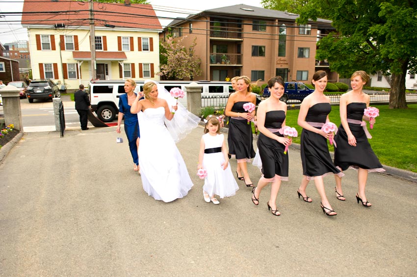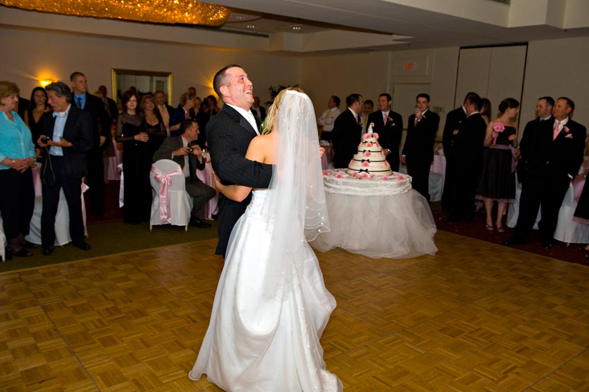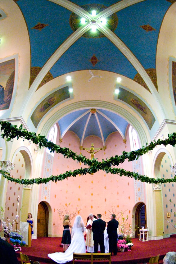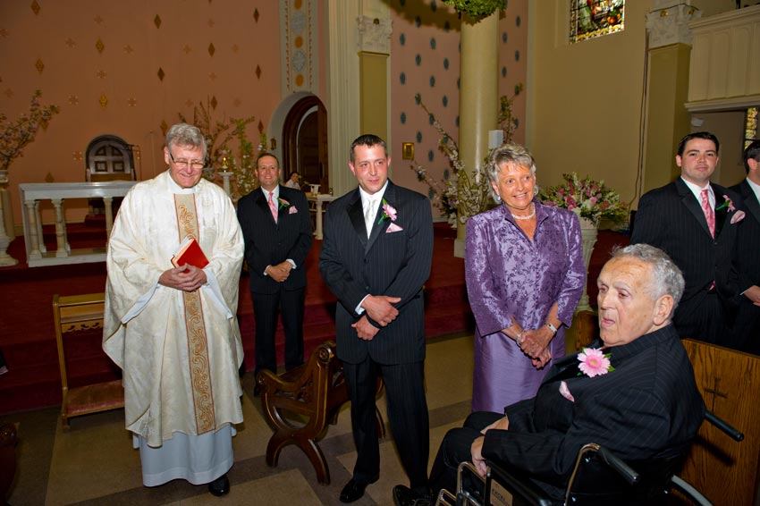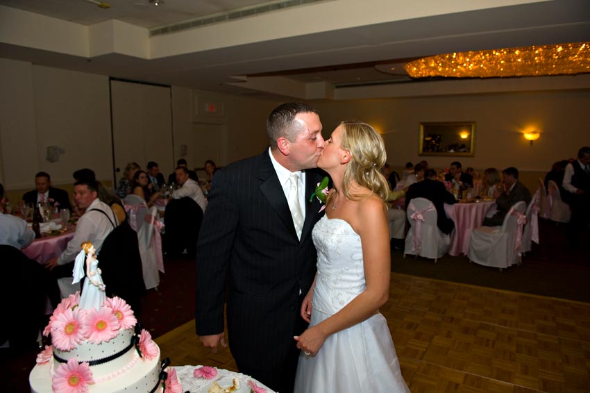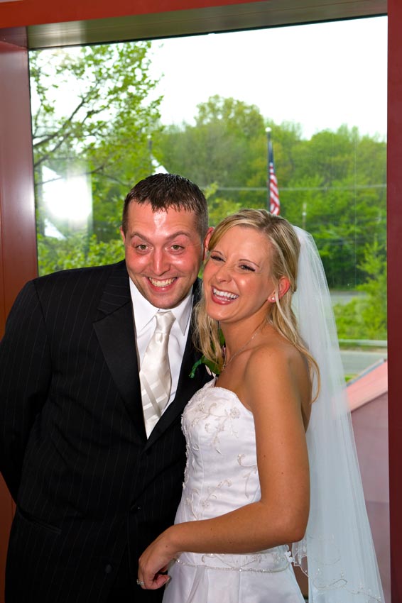 The ceremony was at St. Mary's Parish in Waltham, the largest church I've been to in quite a while. The ceiling had huge panels of paintings, kind of a Sistine Chapel look; you can see them in the fish-eye shot from the balcony. Also, check out the window-reflection in the shot of the bride getting out of the limousine. The reception was at the Doubletree hotel, also in Waltham. Look carefully at the two pictures of the cake --- that little dog figure on the top of the cake mirror's the bride's little doggy (sorry, not seen in these photos). Lot's of dancing, great music, good people, good fun. I had a great time!