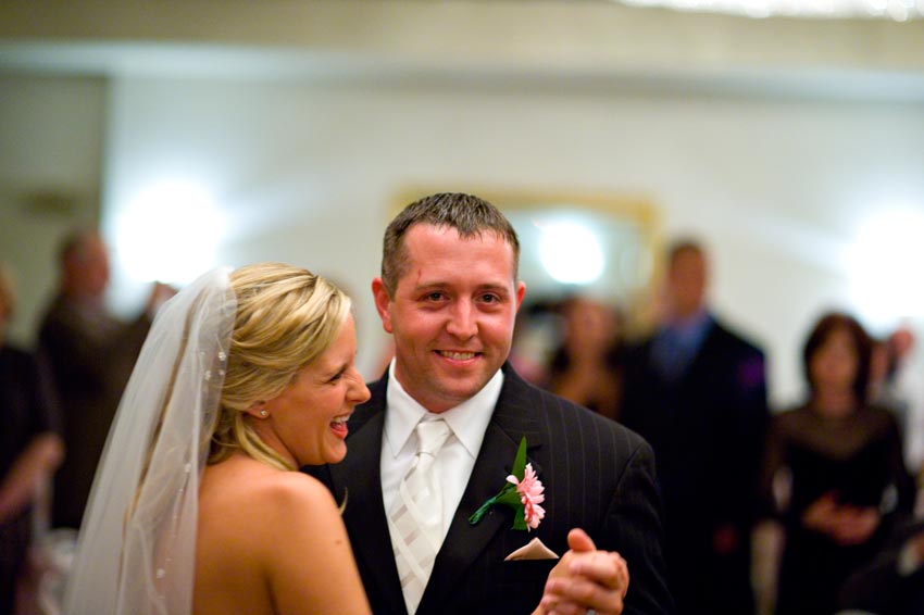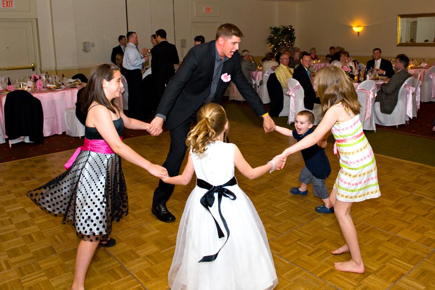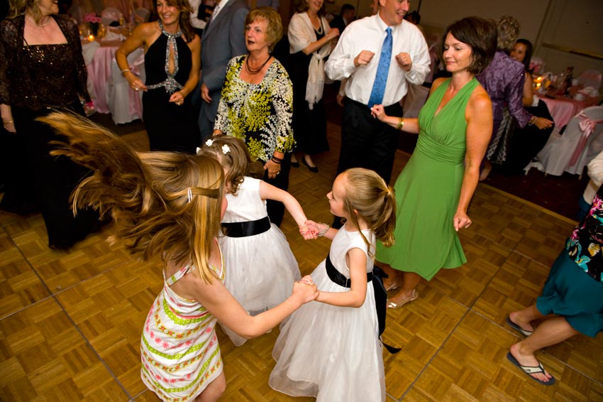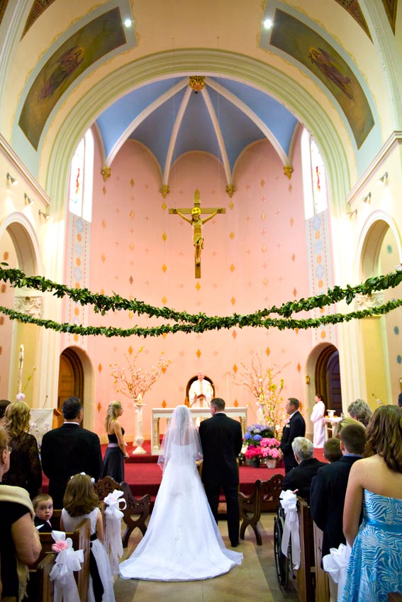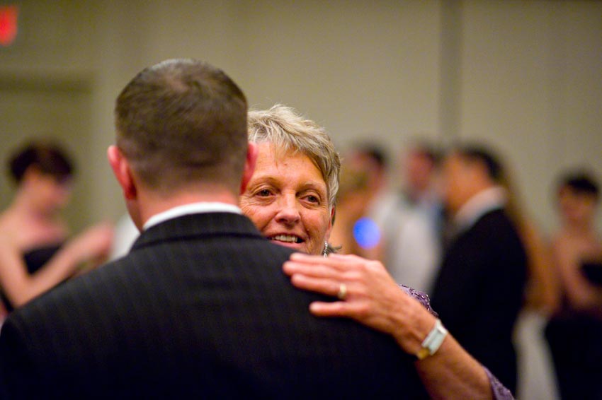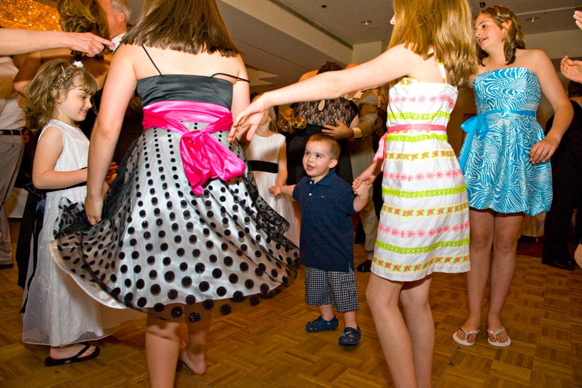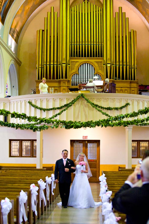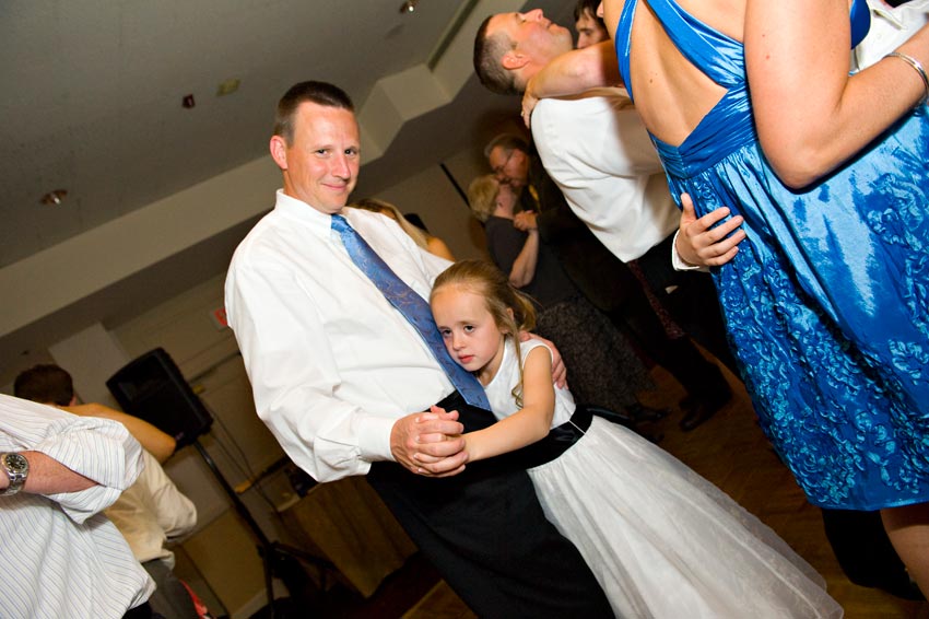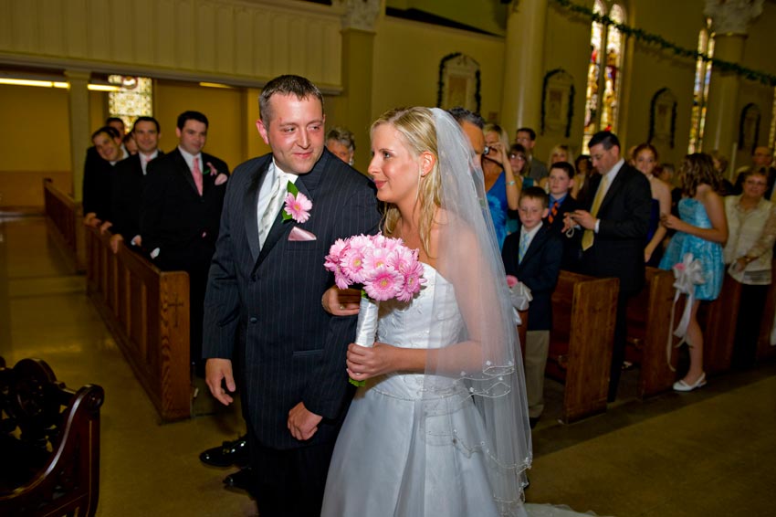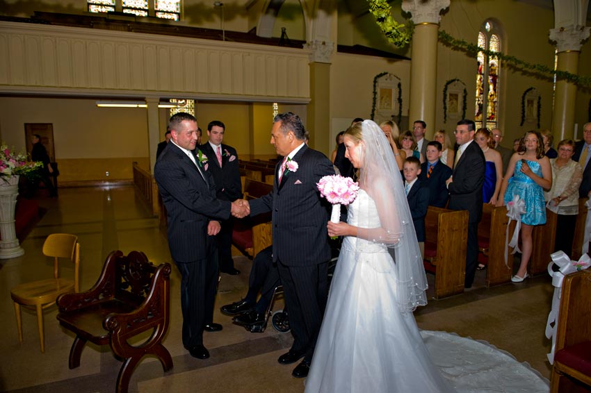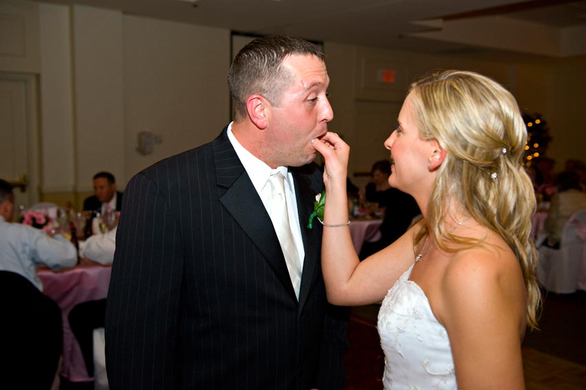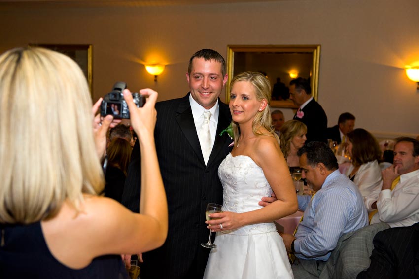 The ceremony was at St. Mary's Parish in Waltham, the largest church I've been to in quite a while. The ceiling had huge panels of paintings, kind of a Sistine Chapel look; you can see them in the fish-eye shot from the balcony. Also, check out the window-reflection in the shot of the bride getting out of the limousine. The reception was at the Doubletree hotel, also in Waltham. Look carefully at the two pictures of the cake --- that little dog figure on the top of the cake mirror's the bride's little doggy (sorry, not seen in these photos). Lot's of dancing, great music, good people, good fun. I had a great time!
