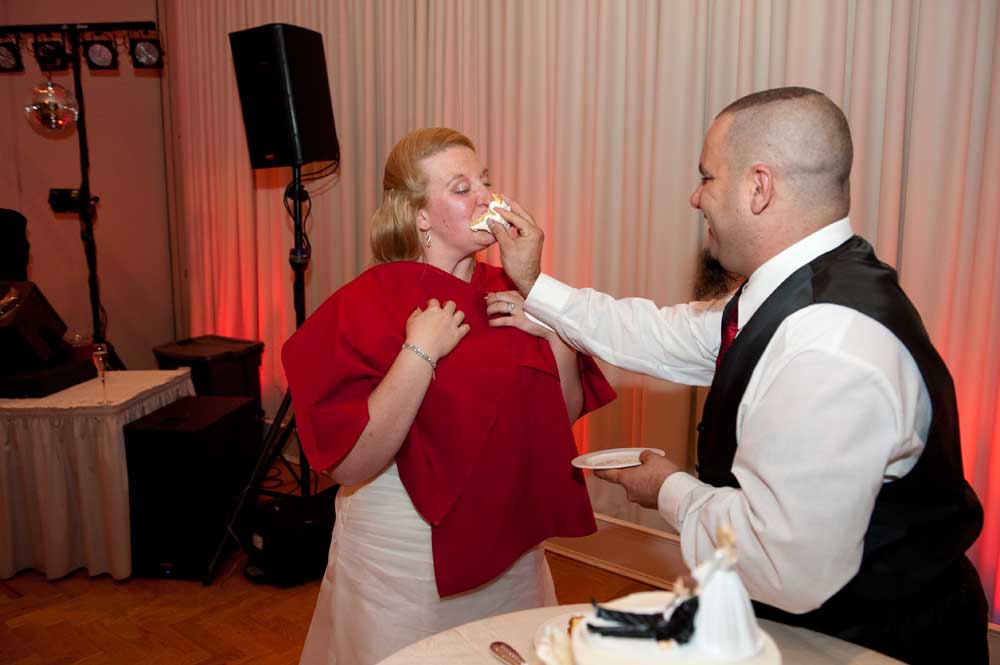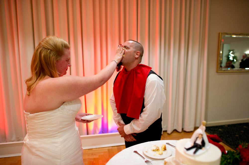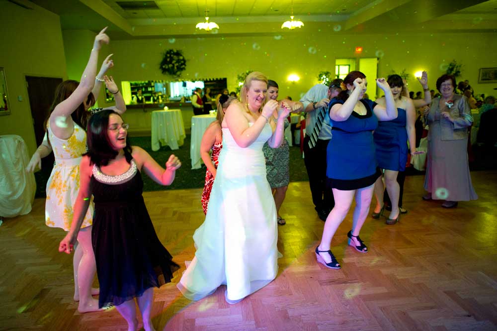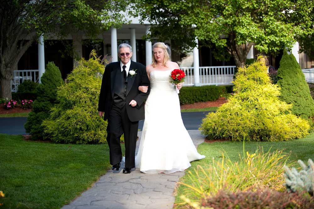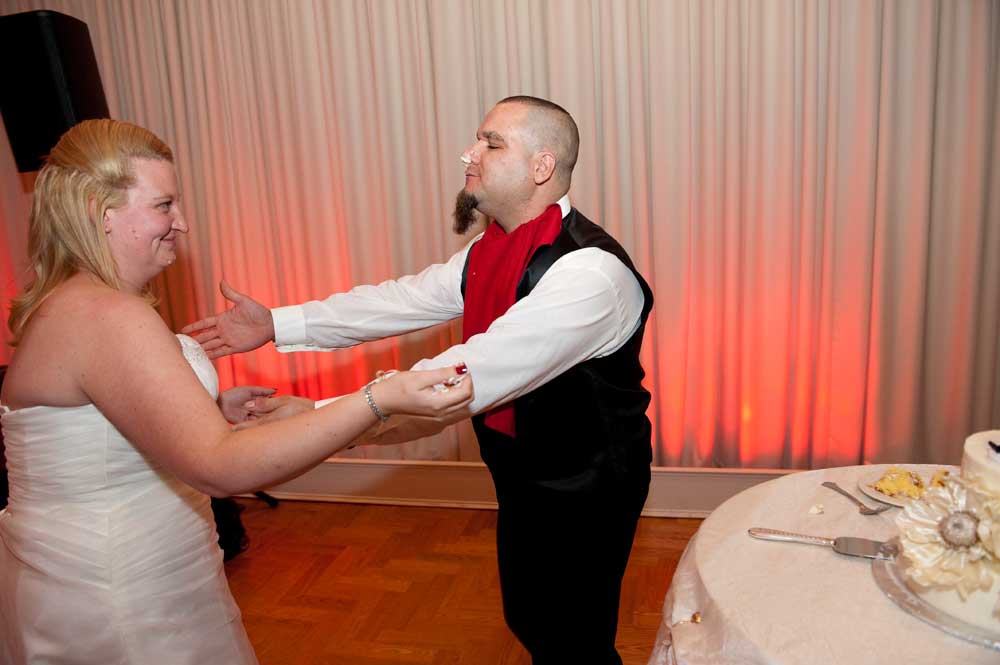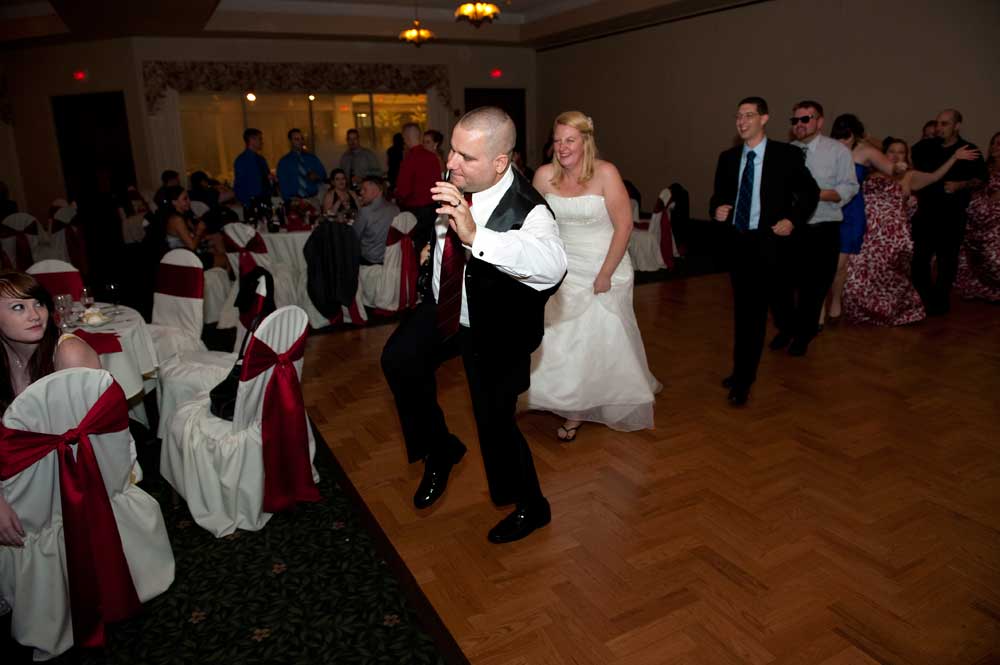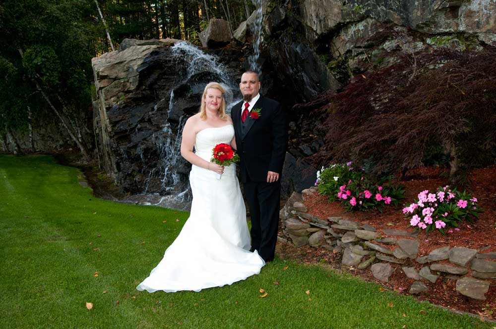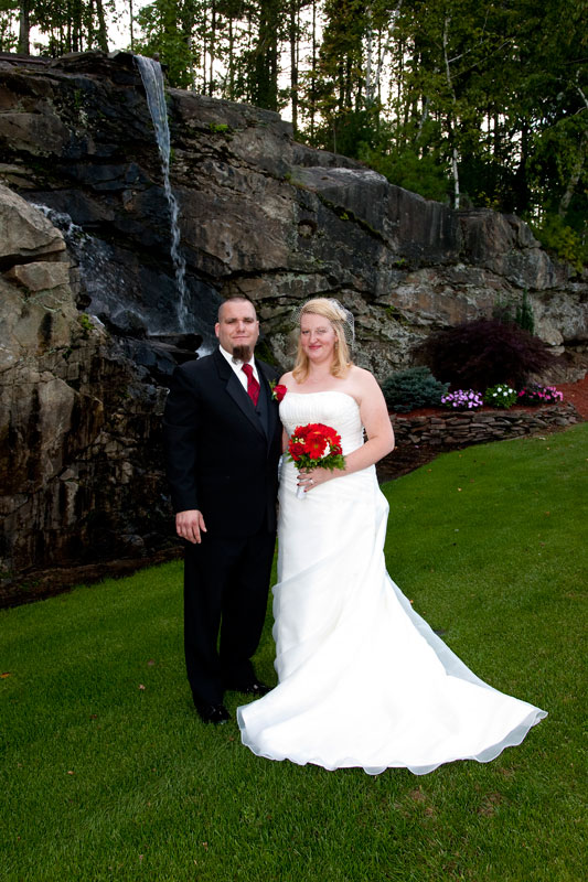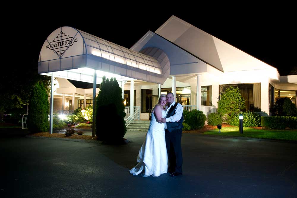 The weather was bright and sunny at Castleton, so we got great formals at the various locations, including the waterfall. The Maid of Honor dissolved into tears (I got a nice shot of it) during her toast, and the cake cutting was quite a "smashing" event. There was a conga line, with tambourine, and a variety of dancing. Late evening shots of the exterior of the grounds rounded out a colorful, fun day. It was a great, fun, wedding!