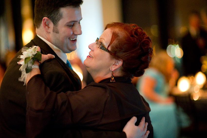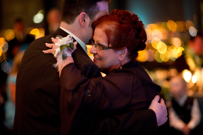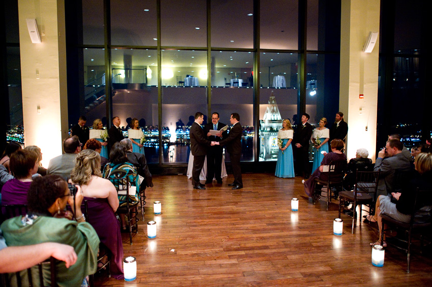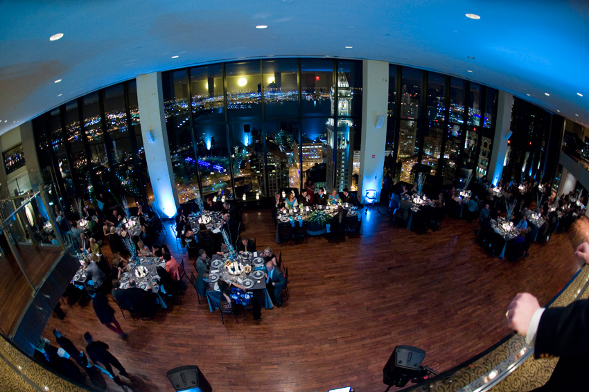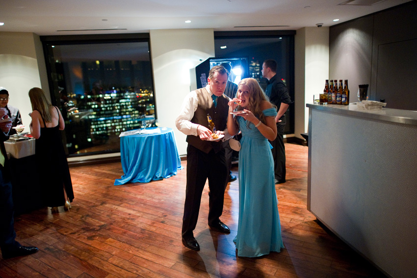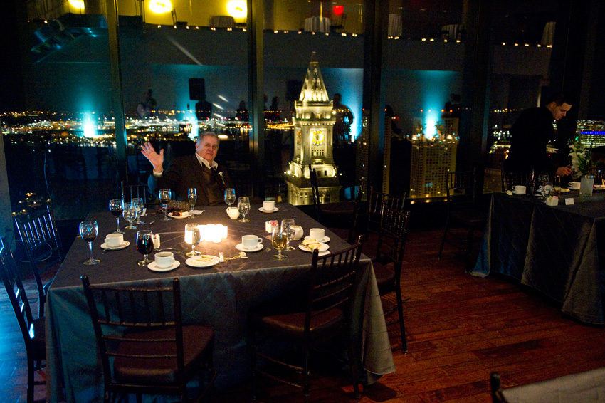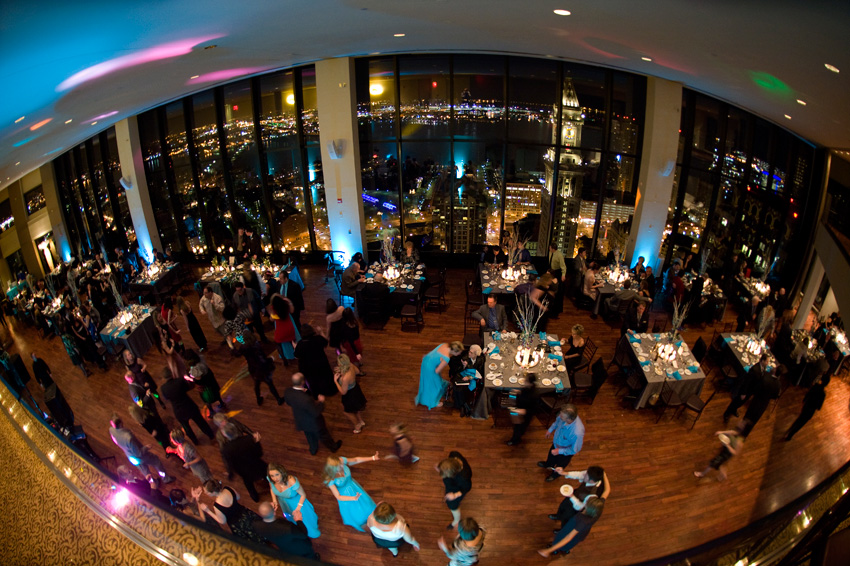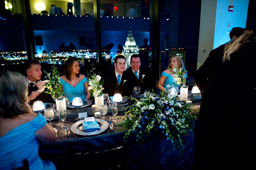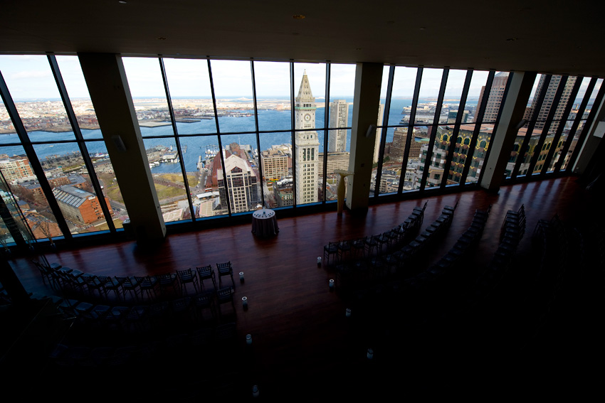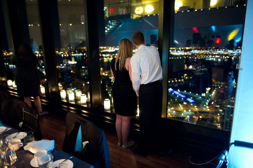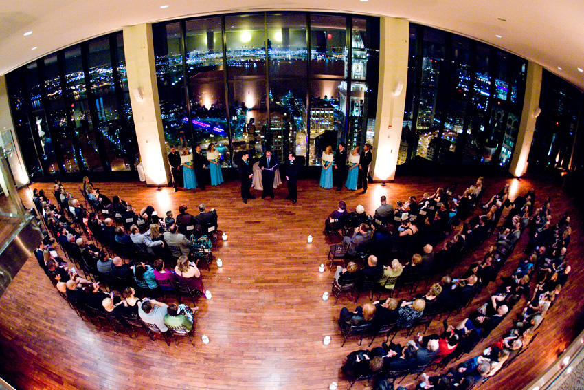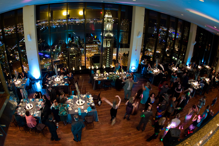 We were lucky again with the weather, and walked from the prep hotel to the State Street building, where all the formals were done before the ceremony. The views were stunning, both in daylight and in darkness. The fish-eye lens got a workout at this wedding. Then, a slide show review of their lives, dancing under varying lights, dinner (stunningly delicious braised short ribs), fancy desserts, photo booth.... and more fish-eyes. What a visual feast!