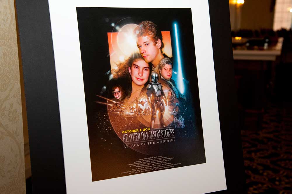 Let me start with the wedding poster, made by the groom, titled HEATHER DAY-JASON STOKES, Attack of the Wedding, with photos of the principles photoshopped onto a Star Wars poster. The credits at the bottom mentioned all the supporting players, giving me credits for the photos. I kept a close up of the credits line for myself (this is just my kind of sense of humor).