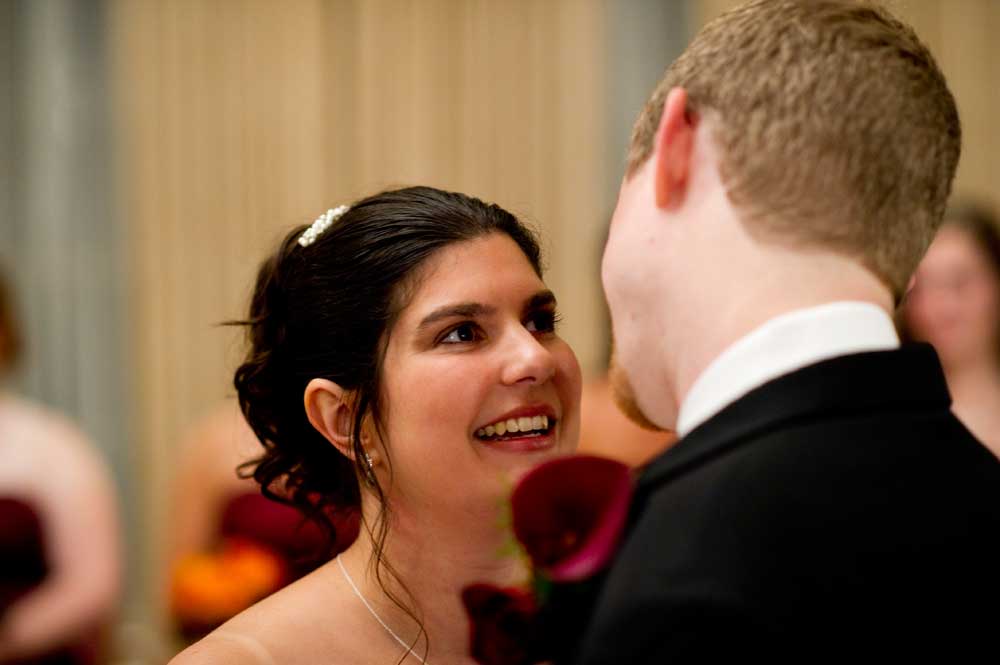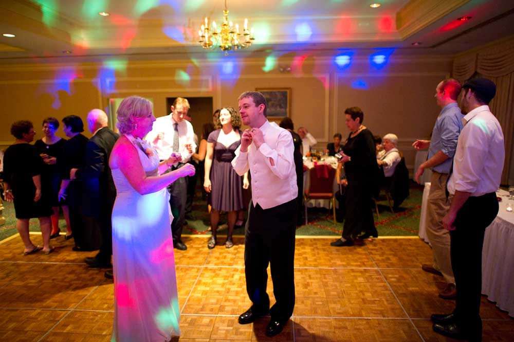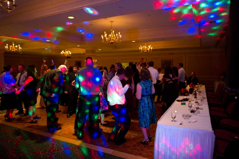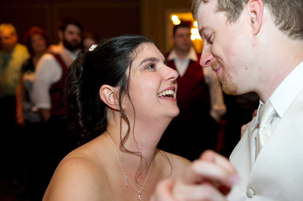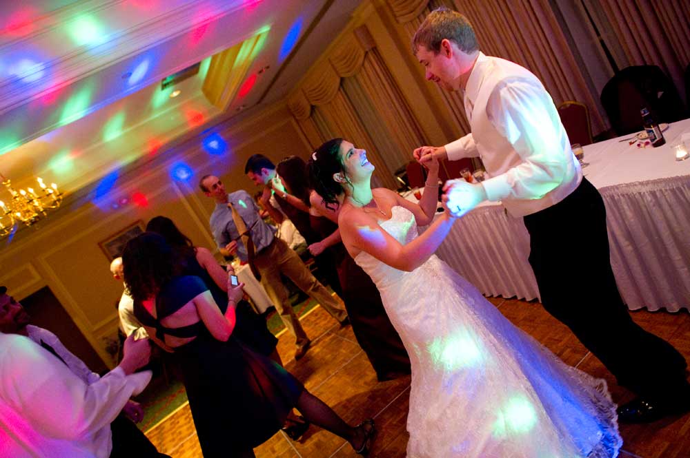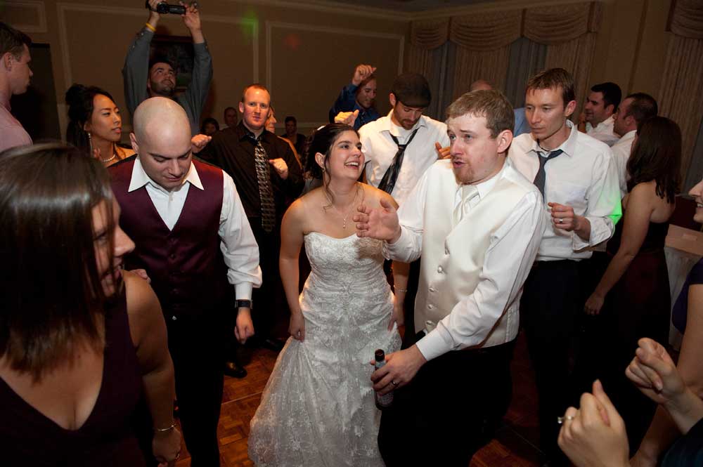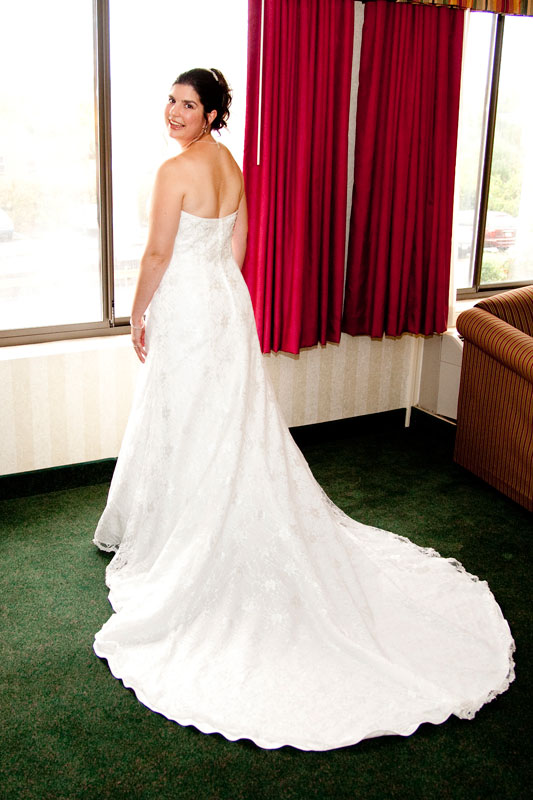 In the famous line from Snoopy, "It was a dark and stormy night...", only on this wedding day, it was dark and rainy all day as well as all night. But, it didn't matter because the bride and groom had astutely planned everything indoors, at the Radisson Hotel. Big rooms, huge mezzanine, dramatic sweeping staircases --- what could be better? We photographed in almost every nook and cranny we could find. The groom is expert in photography and photoshop, but luckily for me, he left his camera home, and counted on me instead. We had great music (with lots of flashing, multicolored lights), and therefore great dancing, jumping, jiving, conga line, and a dance competition led by the DJ. Dinner was delicious -- I had the prime rib -- yum! It was a complete day and night of fun!