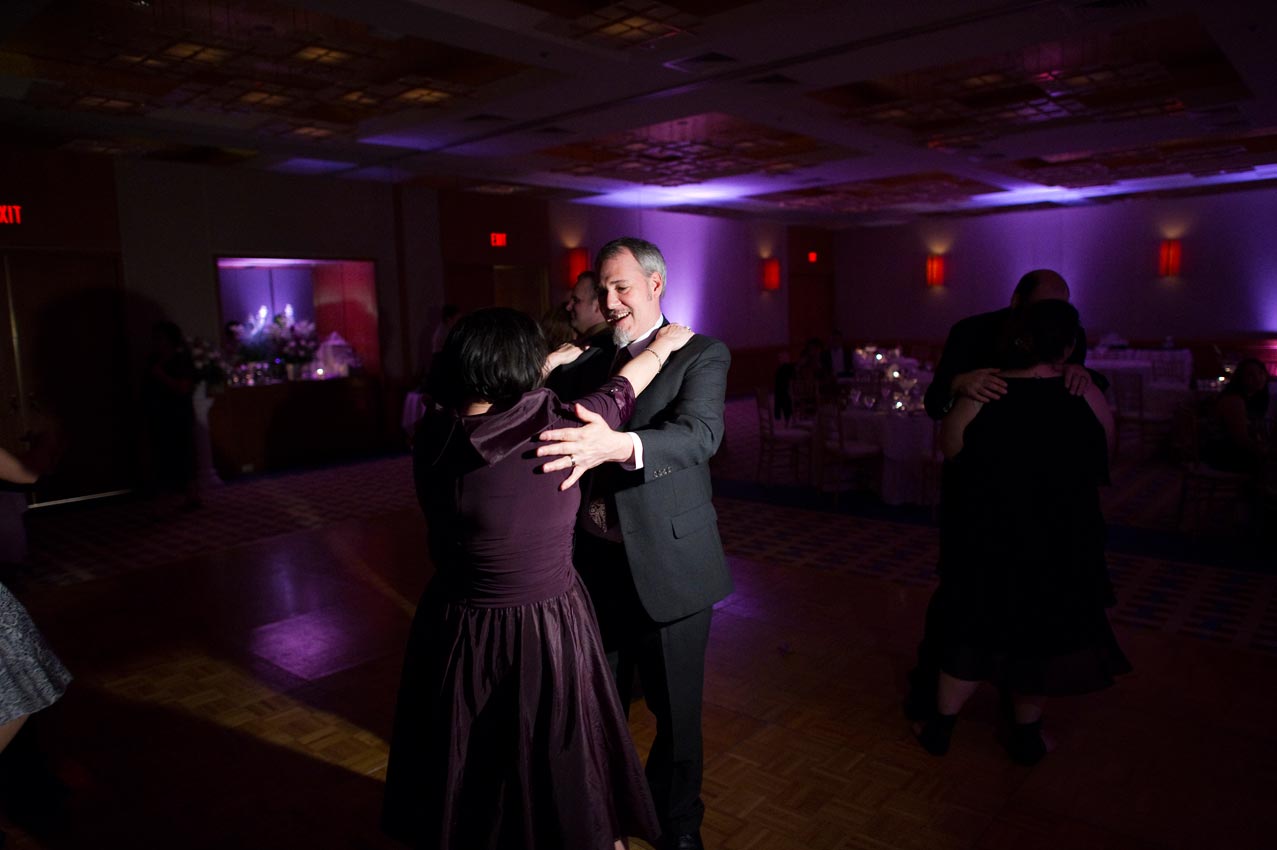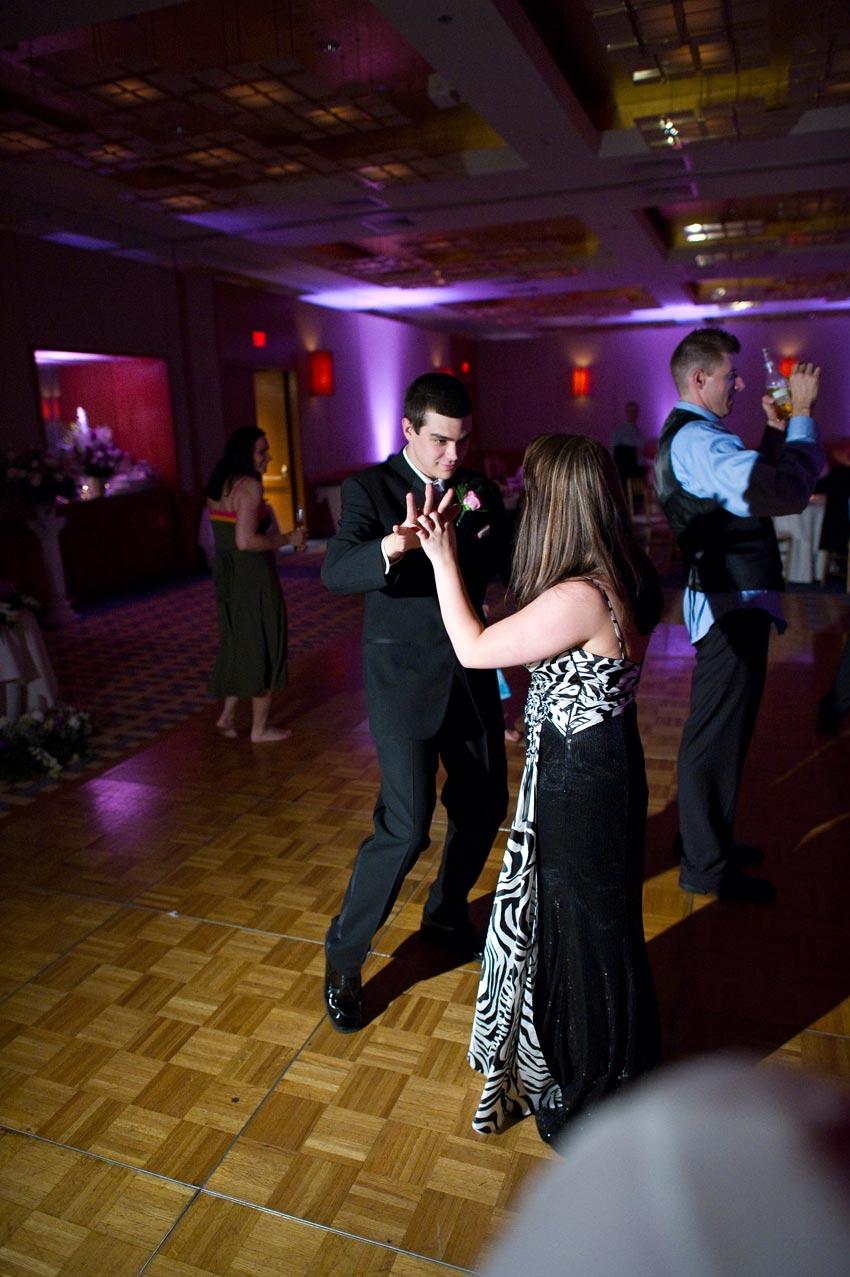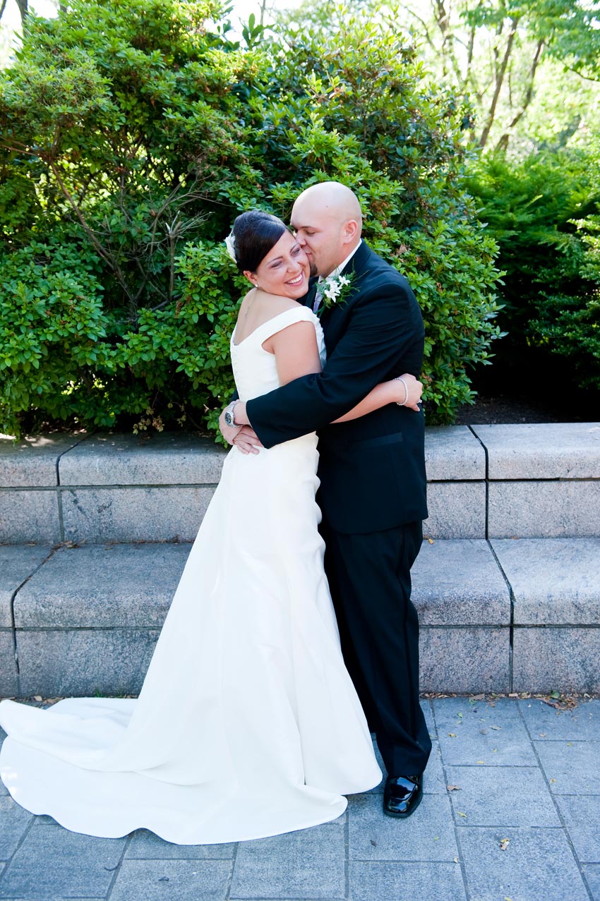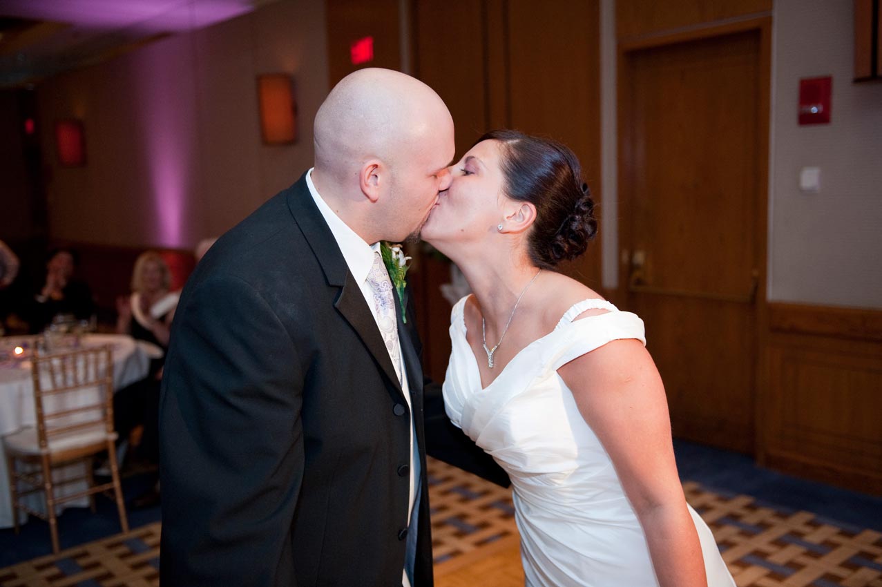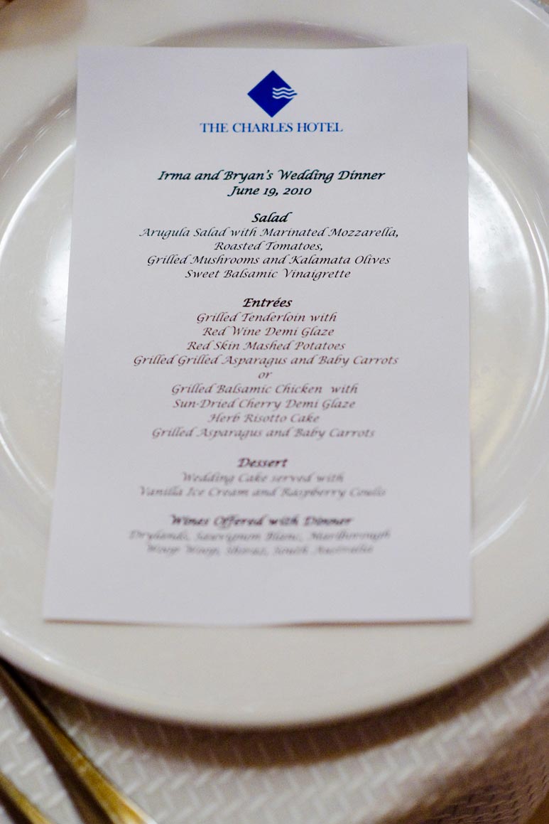 The prep, ceremony, and reception were at the Charles Hotel, in Cambridge, under a strong sun in a cloudless sky. The formals were two blocks down, at J.F. Kennedy Park, by the Charles River. I liked all the vary-colored lights at the reception. About halfway through the evening, someone turned the lights completely off, and the room was lit only by the colored uplights, and the videographer's video light. It was a very interesting "nightclub" look. The food was fantastic - huge filet mignons cooked perfectly, with a delicious sauce over mashed potatoes, asparagus, and baby carrots (that's the one I had - the grilled balsamic chicken with sun-dried cherry demi glaze and herb risotto cake looked delicious also). It was a great wedding; congratulations to Irma and Bryan, and their families!