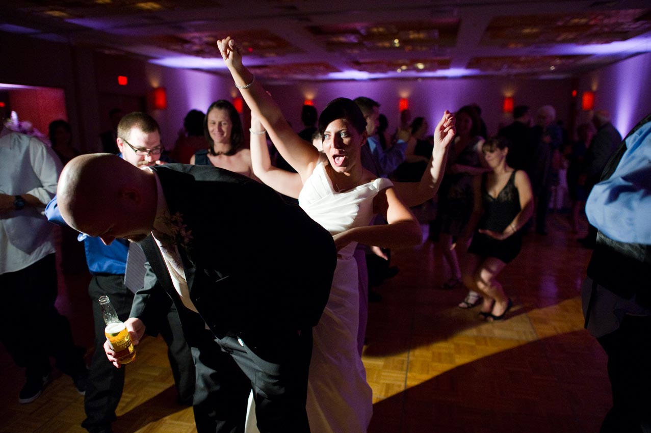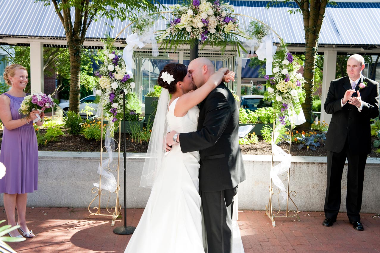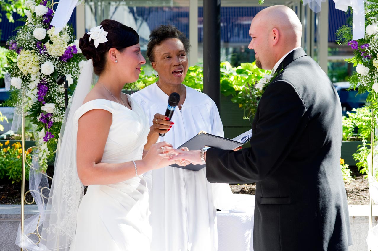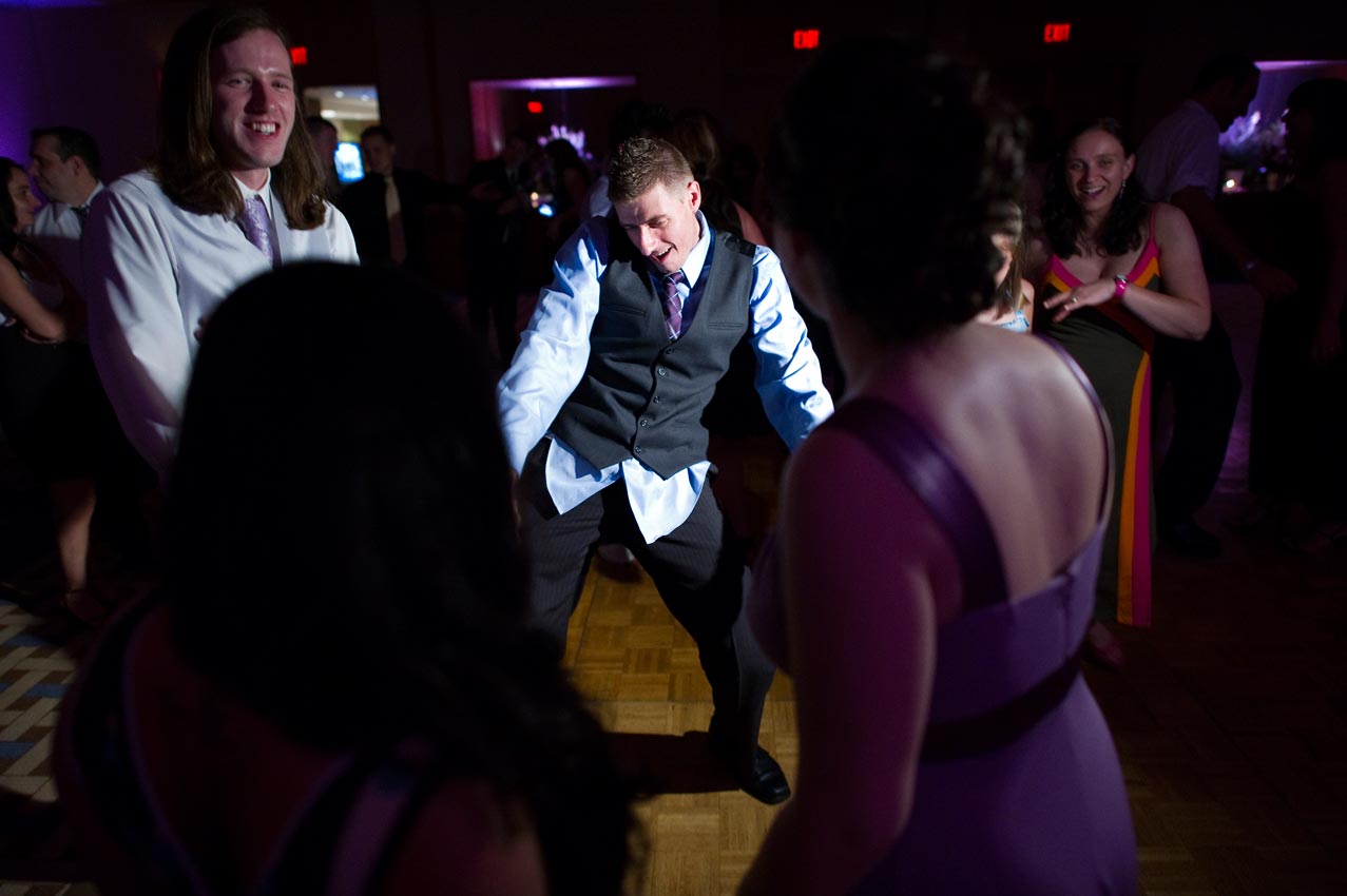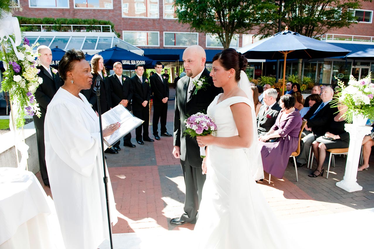 The prep, ceremony, and reception were at the Charles Hotel, in Cambridge, under a strong sun in a cloudless sky. The formals were two blocks down, at J.F. Kennedy Park, by the Charles River. I liked all the vary-colored lights at the reception. About halfway through the evening, someone turned the lights completely off, and the room was lit only by the colored uplights, and the videographer's video light. It was a very interesting "nightclub" look. The food was fantastic - huge filet mignons cooked perfectly, with a delicious sauce over mashed potatoes, asparagus, and baby carrots (that's the one I had - the grilled balsamic chicken with sun-dried cherry demi glaze and herb risotto cake looked delicious also). It was a great wedding; congratulations to Irma and Bryan, and their families!