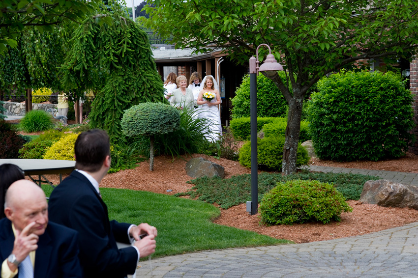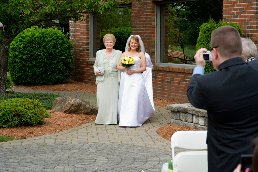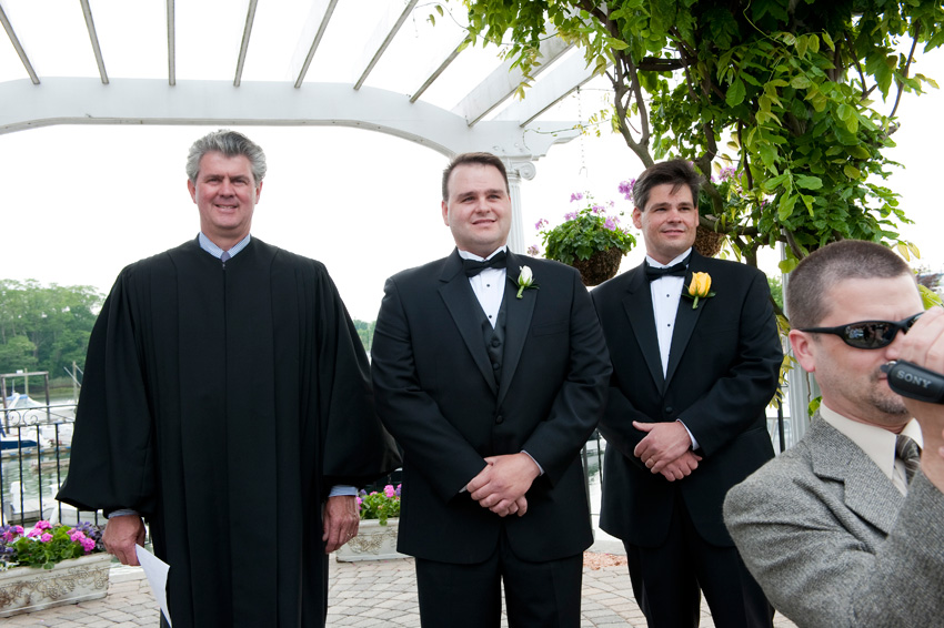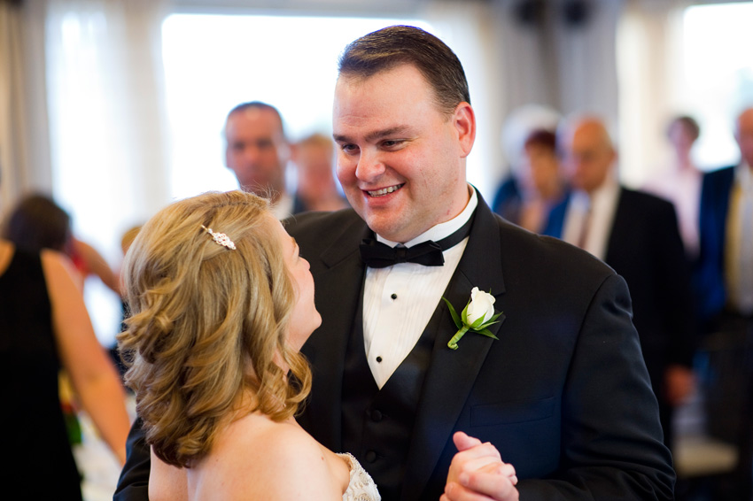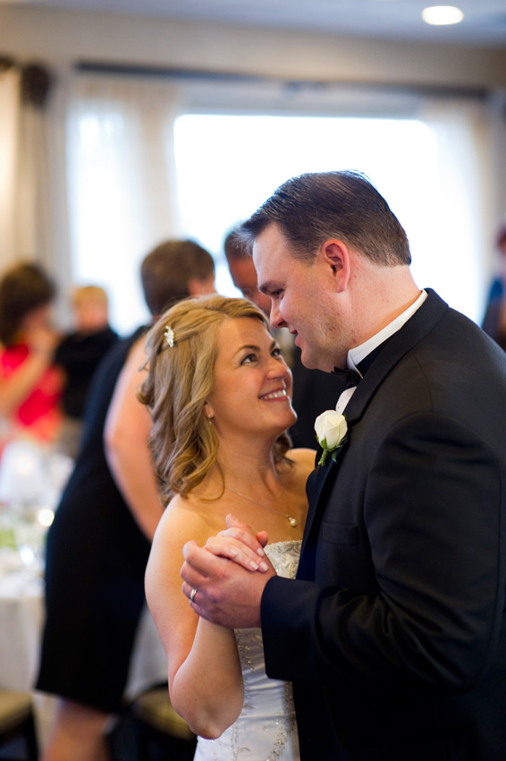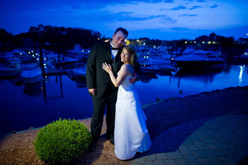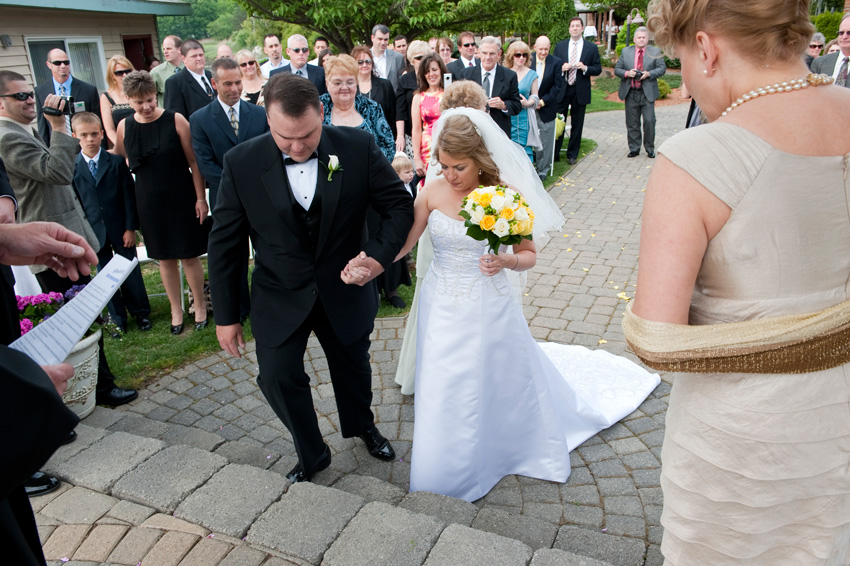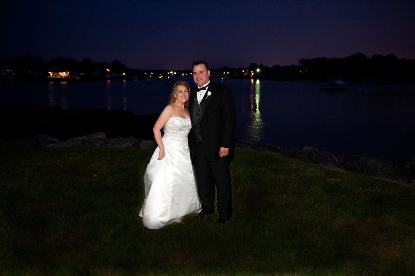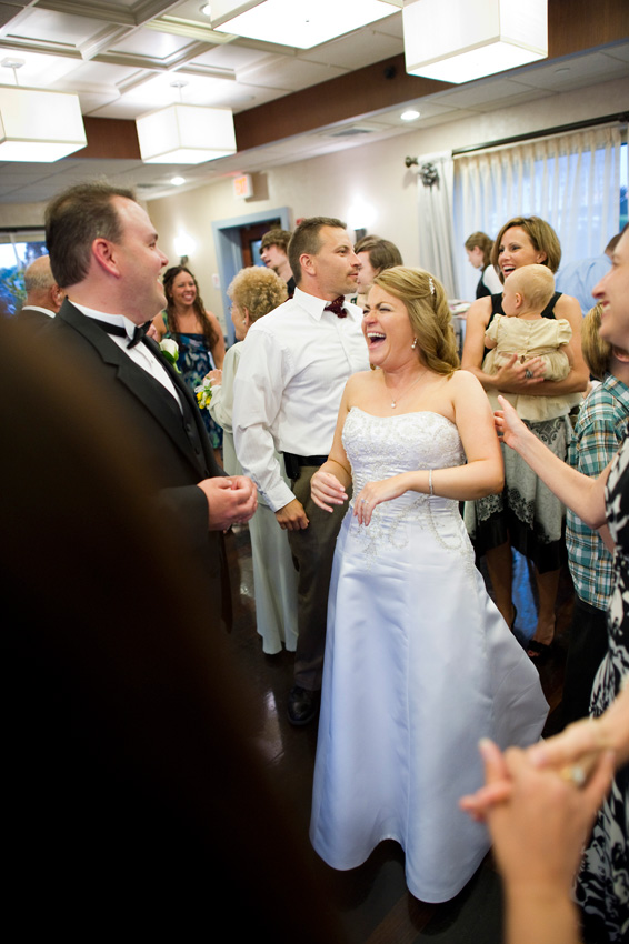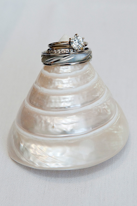 We had harsh sun for the rehearsal the day before the wedding, but the next day it was mostly cloudy, so the sun wasn't in everyones' eyes. A few sprinkles served to remind us of what we were missing. The evening was clear, so we were able to get some outdoor shots. The rings were shot on a "wedding-cake" shell. The dancing was fantastic and everyone really enjoyed themselves. Congratulations, Julie and Steve!