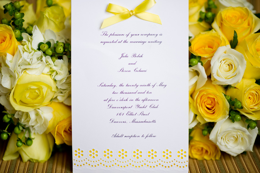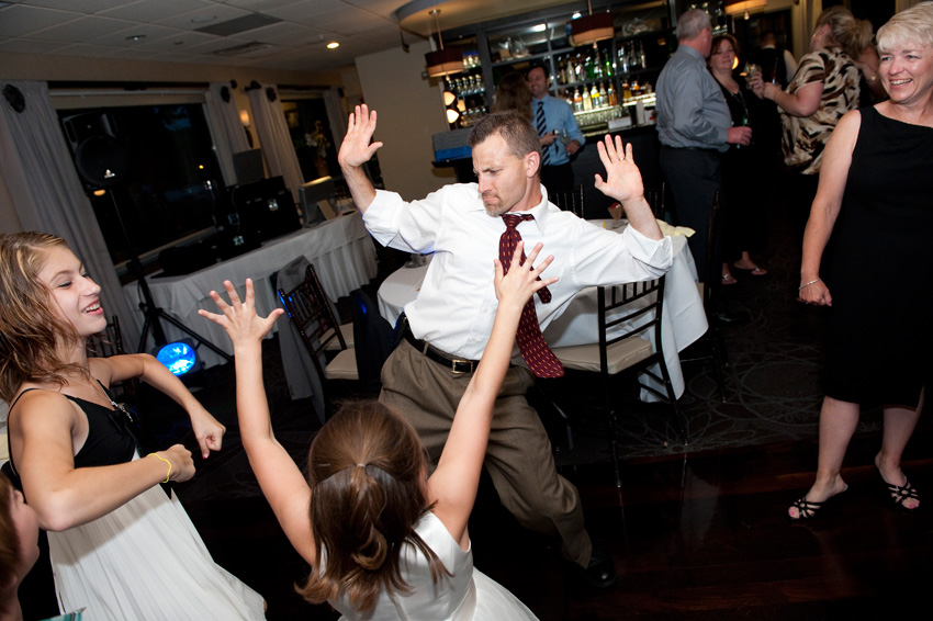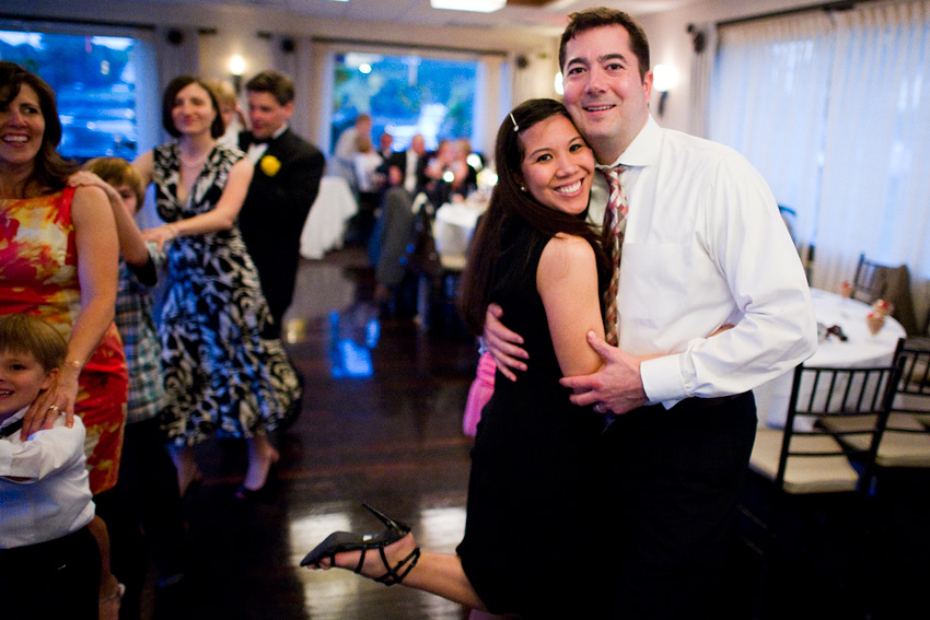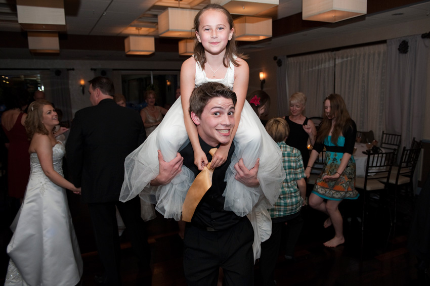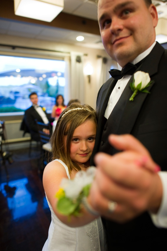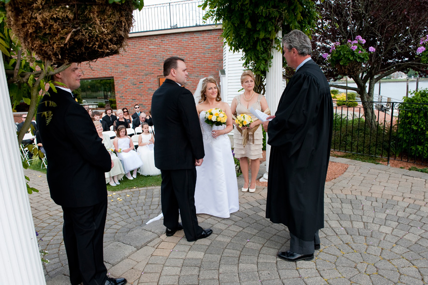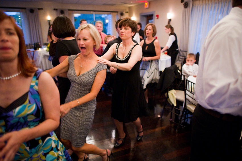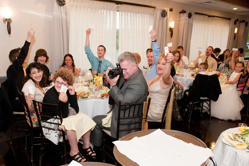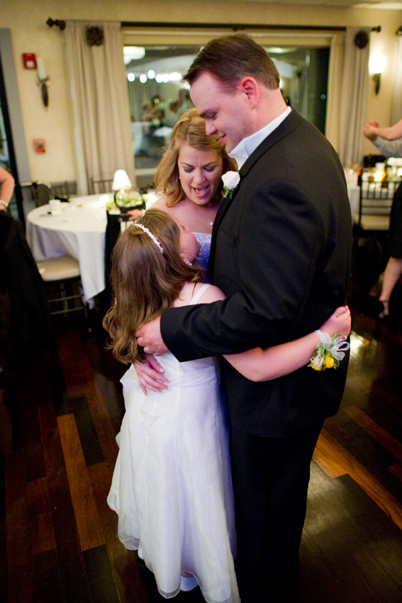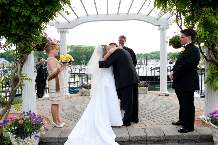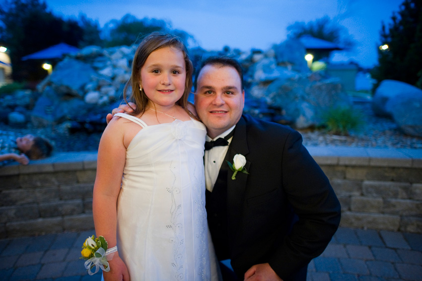 We had harsh sun for the rehearsal the day before the wedding, but the next day it was mostly cloudy, so the sun wasn't in everyones' eyes. A few sprinkles served to remind us of what we were missing. The evening was clear, so we were able to get some outdoor shots. The rings were shot on a "wedding-cake" shell. The dancing was fantastic and everyone really enjoyed themselves. Congratulations, Julie and Steve!