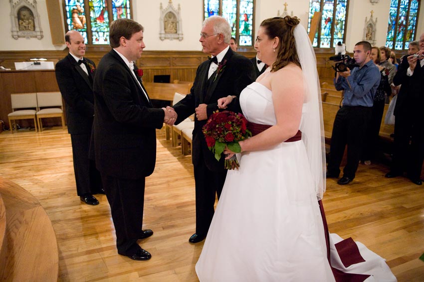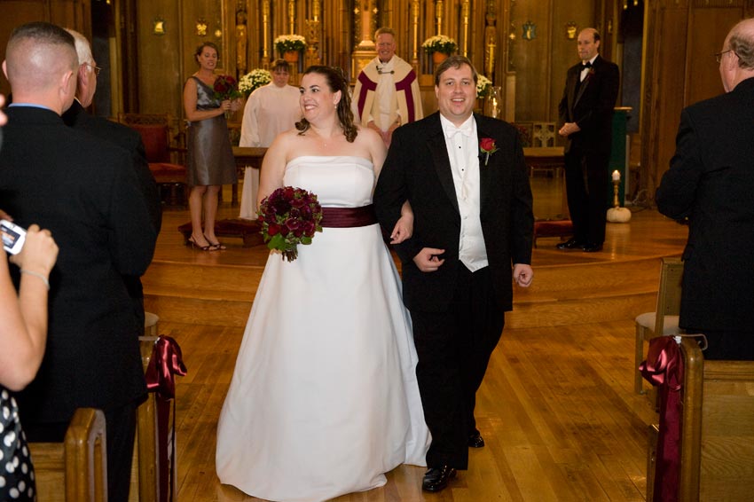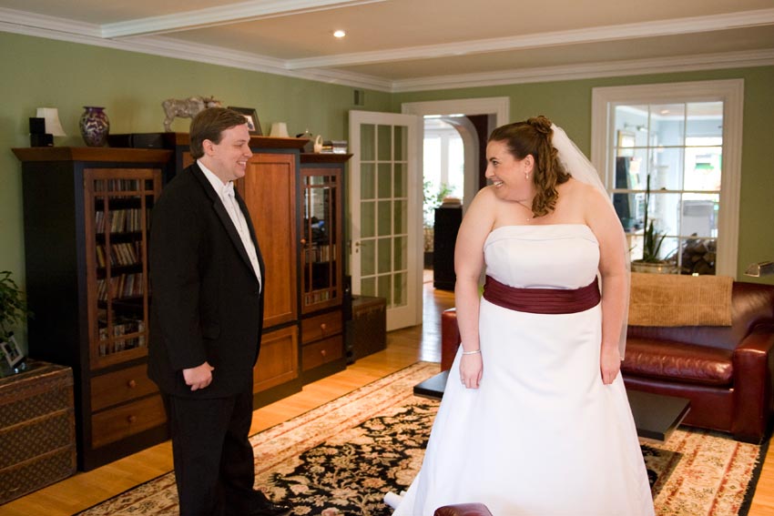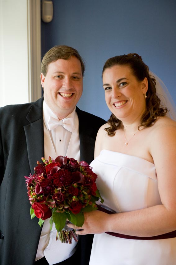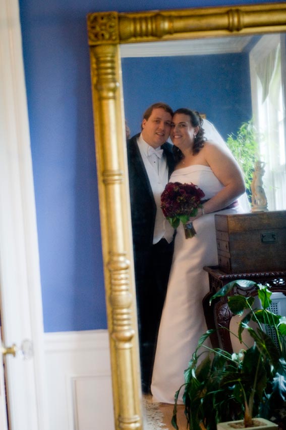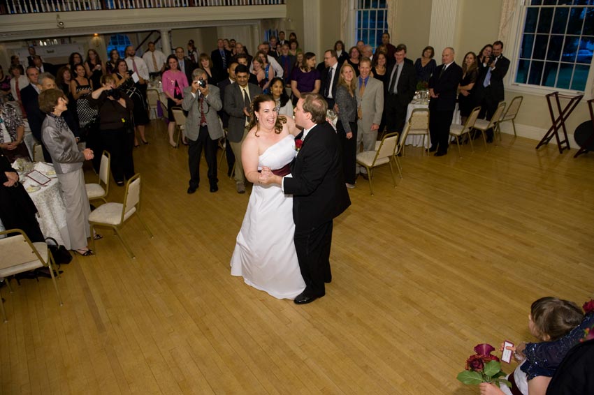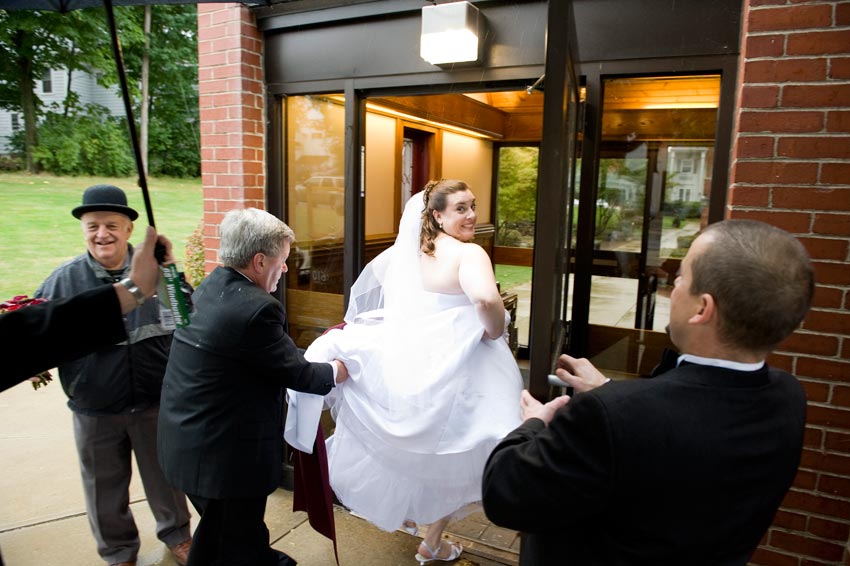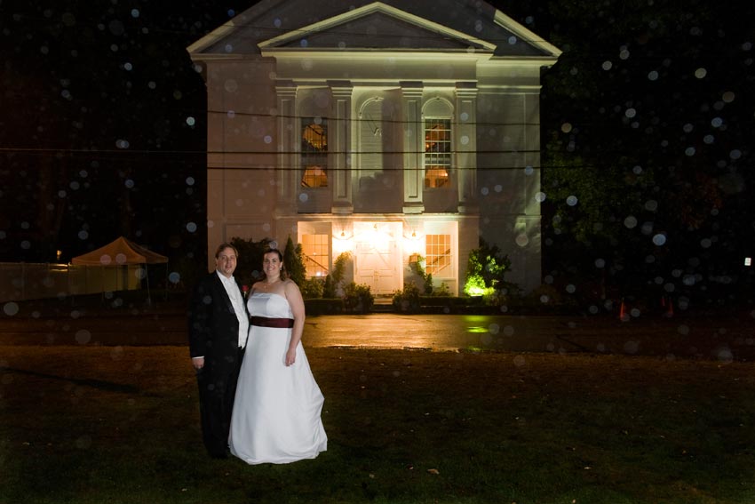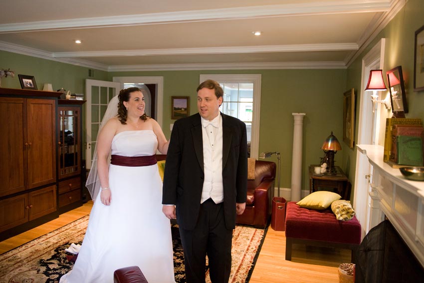 Kellie and Wes were wise to have a pre-ceremony "first seeing" in a beautiful home near the church. We got some great shots of them seeing each other for the first time in their wedding outfits. Then, we ran through the raindrops (kept happening all day) to the church for a gorgeous ceremony (check out the stained glass window behind the bride and her Dad during the procession) with formals on the altar afterwards, and then on to the reception at the Topsfield Commons. Near the end of the evening, we went outside in a light rain for a final shot of the couple in front of the Commons building. Everyone had a great time, and the duck (a family tradition) was present!