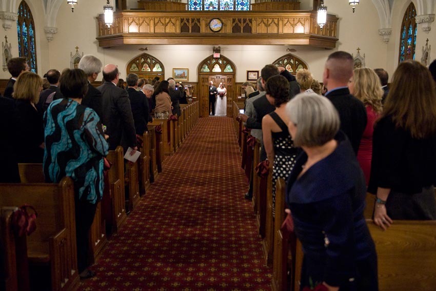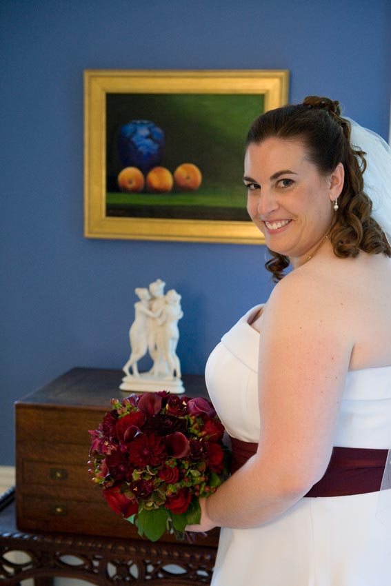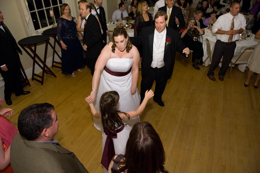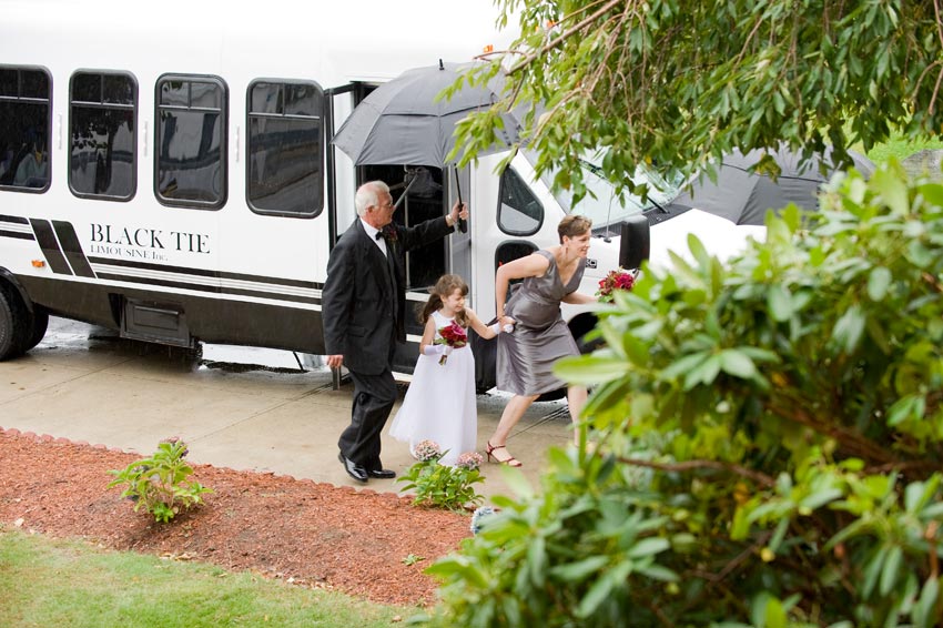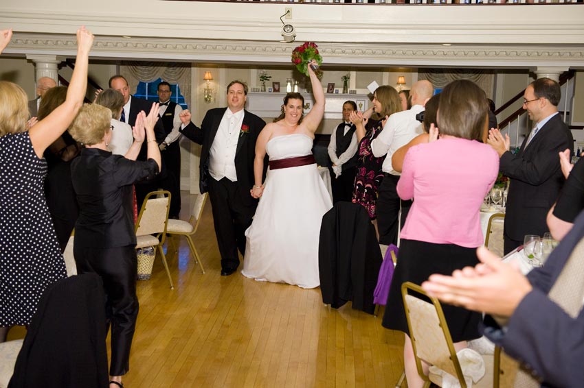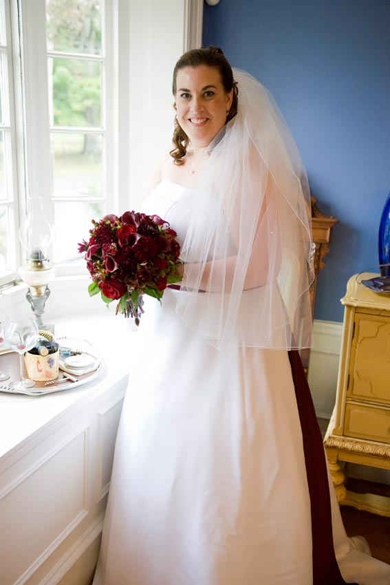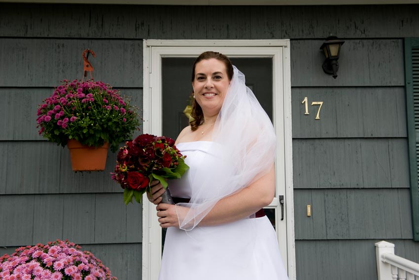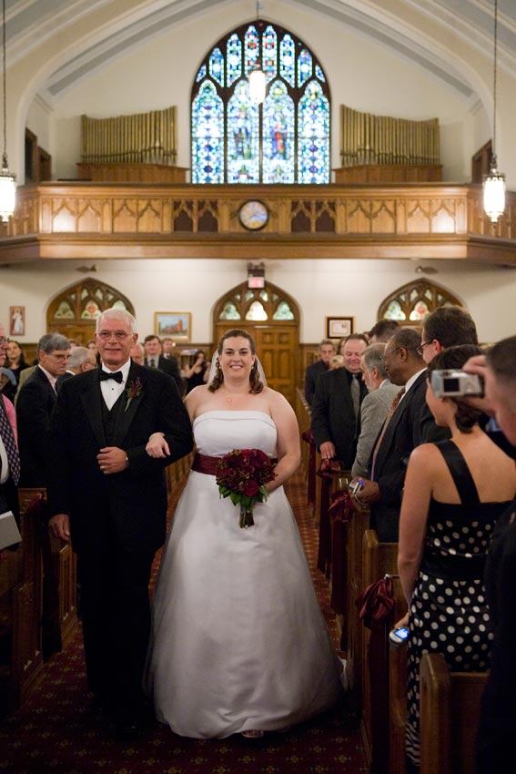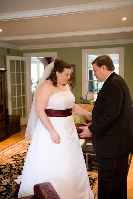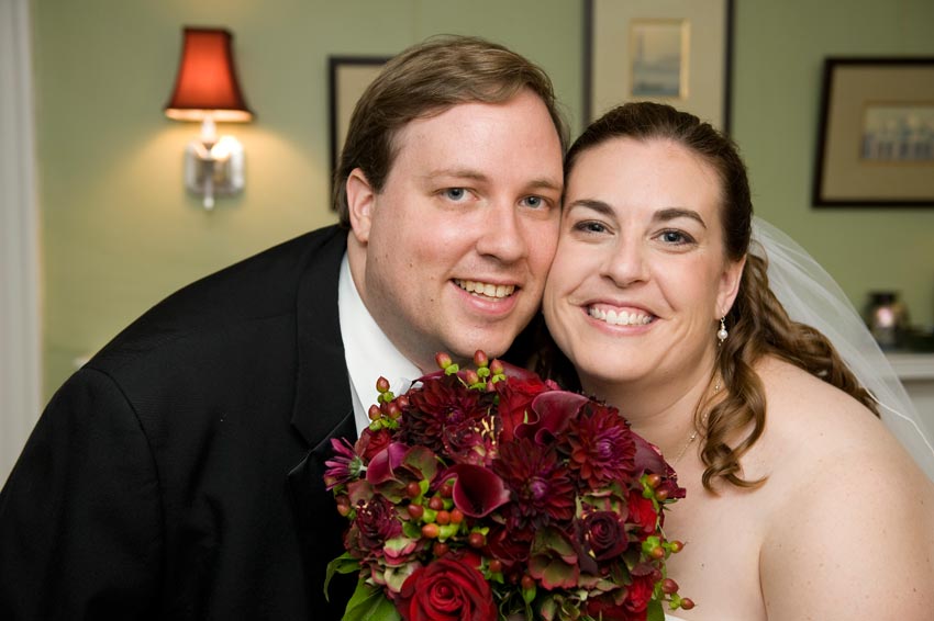 Kellie and Wes were wise to have a pre-ceremony "first seeing" in a beautiful home near the church. We got some great shots of them seeing each other for the first time in their wedding outfits. Then, we ran through the raindrops (kept happening all day) to the church for a gorgeous ceremony (check out the stained glass window behind the bride and her Dad during the procession) with formals on the altar afterwards, and then on to the reception at the Topsfield Commons. Near the end of the evening, we went outside in a light rain for a final shot of the couple in front of the Commons building. Everyone had a great time, and the duck (a family tradition) was present!
