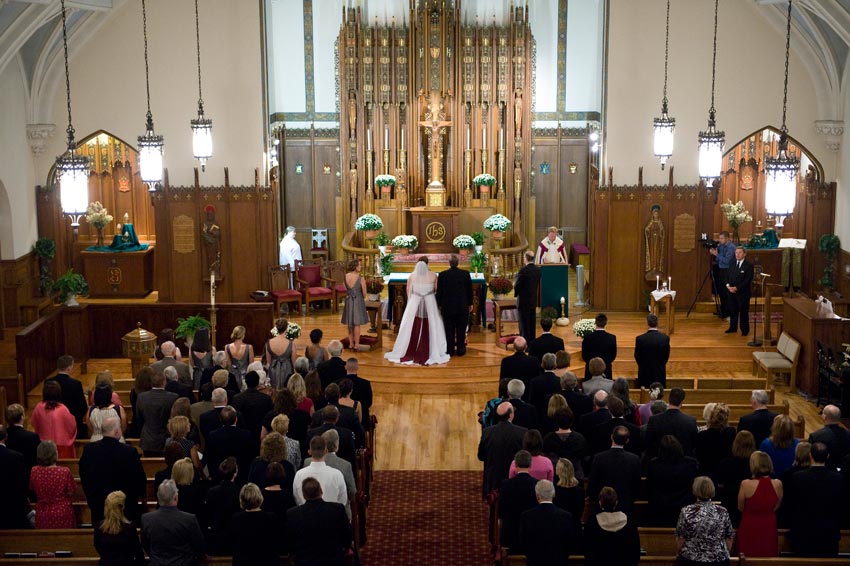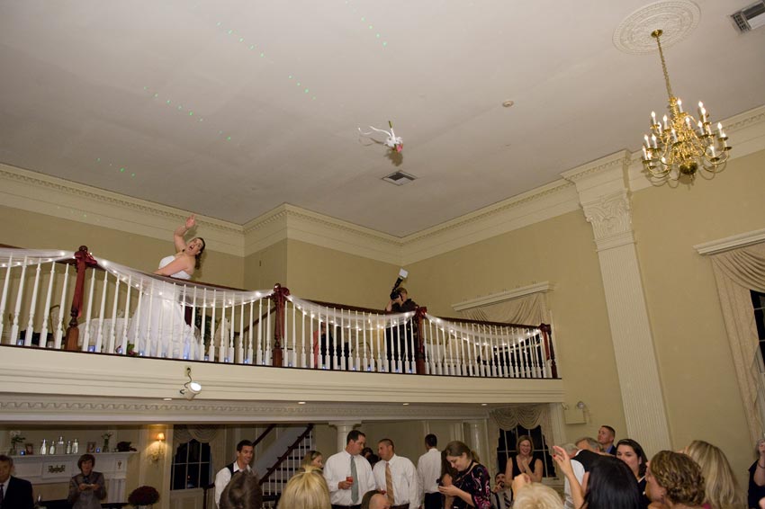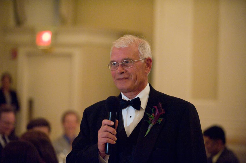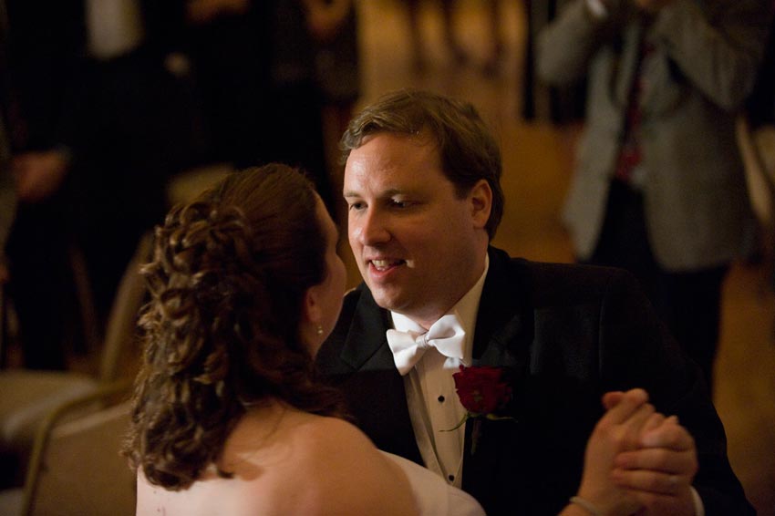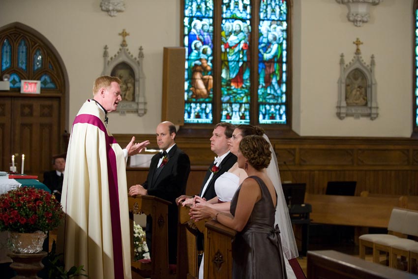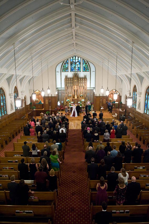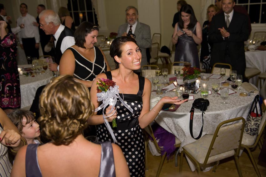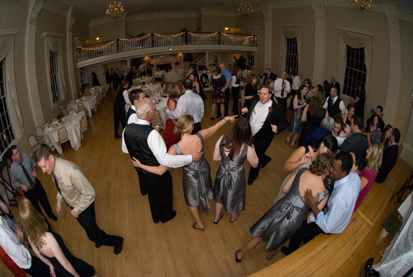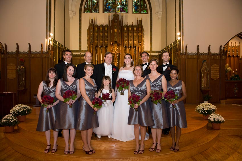 Kellie and Wes were wise to have a pre-ceremony "first seeing" in a beautiful home near the church. We got some great shots of them seeing each other for the first time in their wedding outfits. Then, we ran through the raindrops (kept happening all day) to the church for a gorgeous ceremony (check out the stained glass window behind the bride and her Dad during the procession) with formals on the altar afterwards, and then on to the reception at the Topsfield Commons. Near the end of the evening, we went outside in a light rain for a final shot of the couple in front of the Commons building. Everyone had a great time, and the duck (a family tradition) was present!