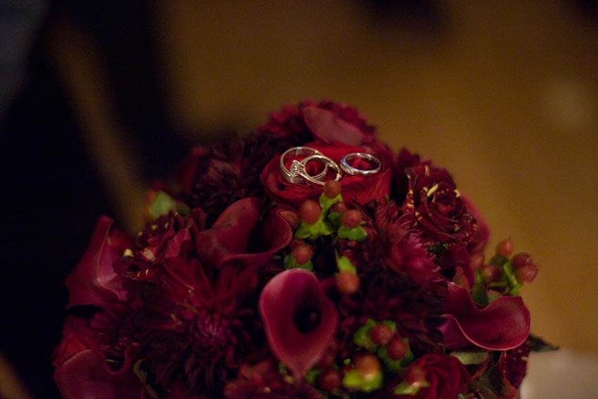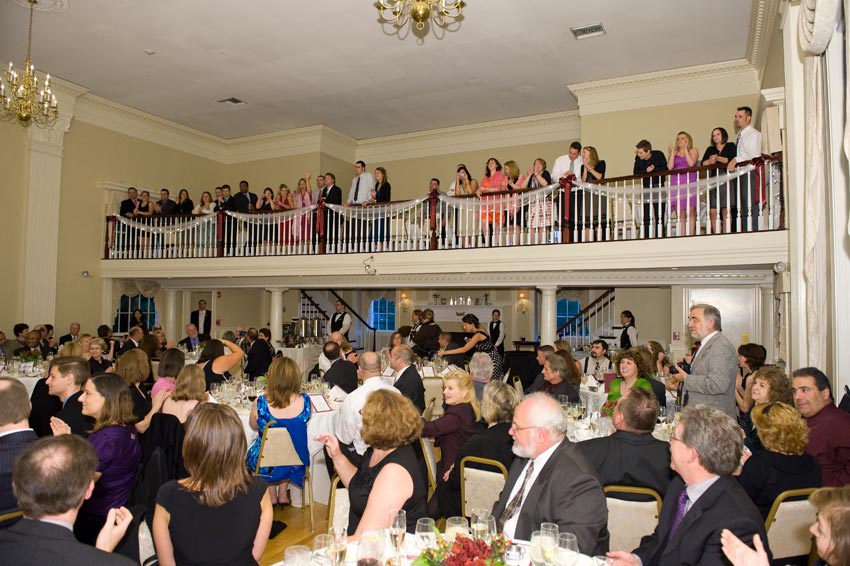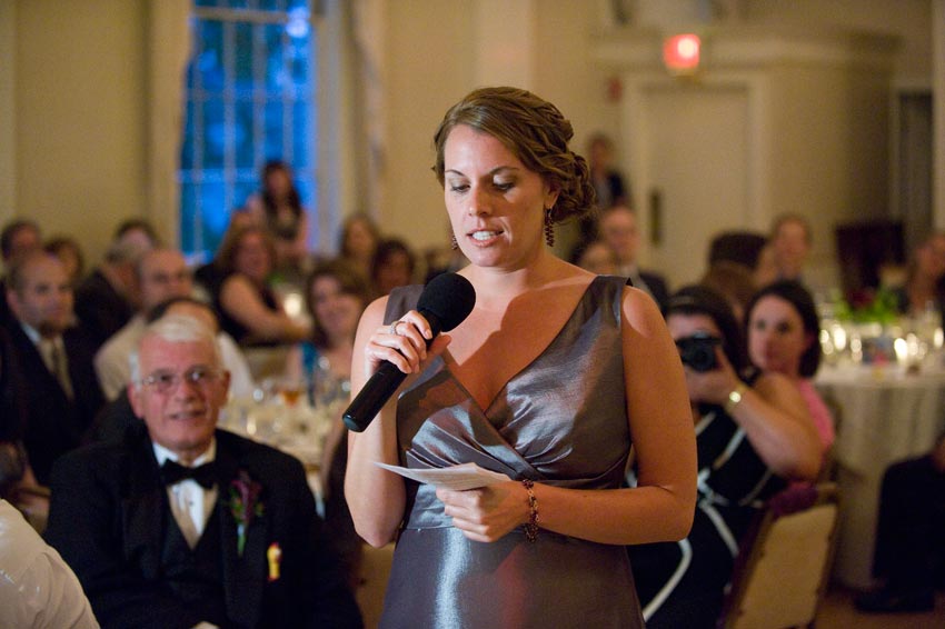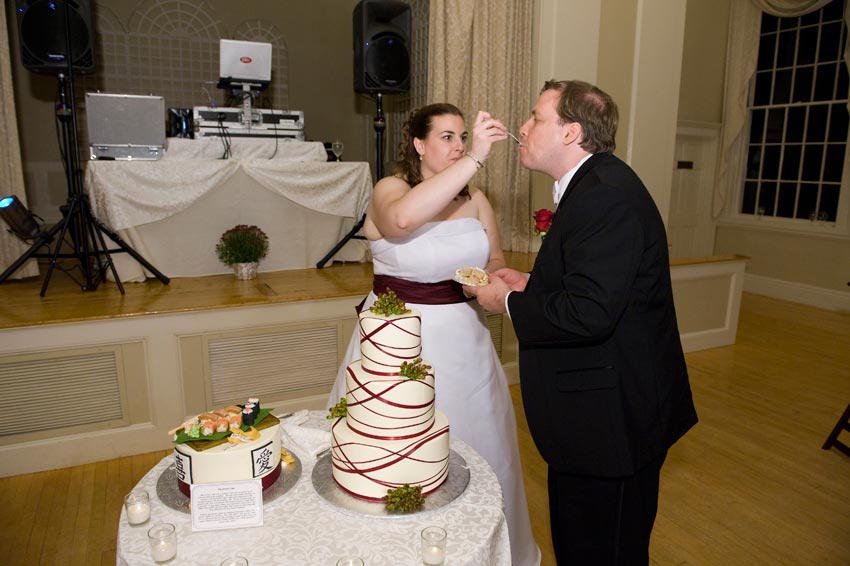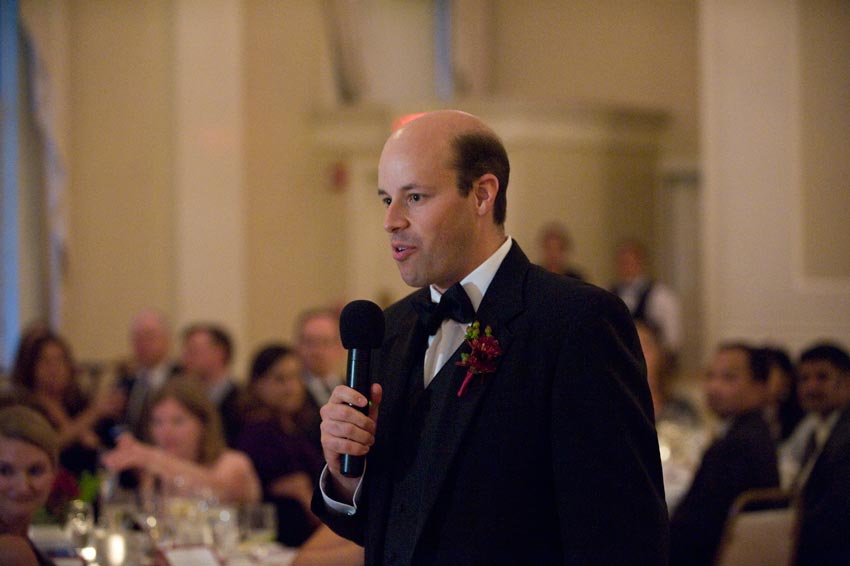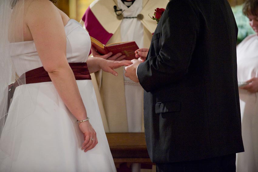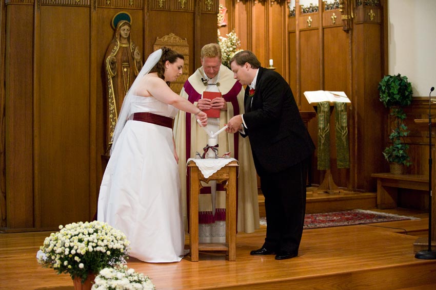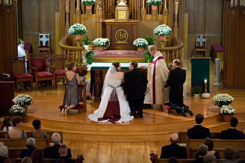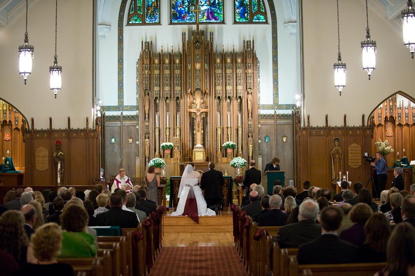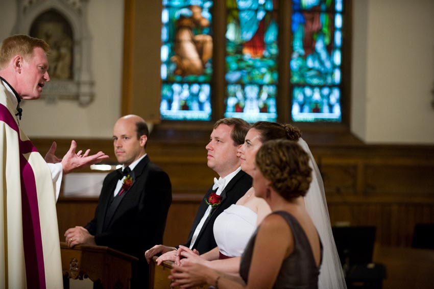 Kellie and Wes were wise to have a pre-ceremony "first seeing" in a beautiful home near the church. We got some great shots of them seeing each other for the first time in their wedding outfits. Then, we ran through the raindrops (kept happening all day) to the church for a gorgeous ceremony (check out the stained glass window behind the bride and her Dad during the procession) with formals on the altar afterwards, and then on to the reception at the Topsfield Commons. Near the end of the evening, we went outside in a light rain for a final shot of the couple in front of the Commons building. Everyone had a great time, and the duck (a family tradition) was present!