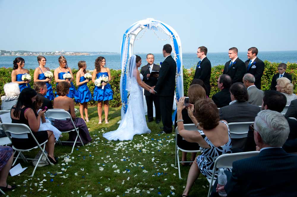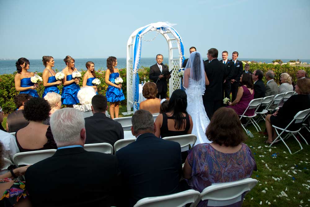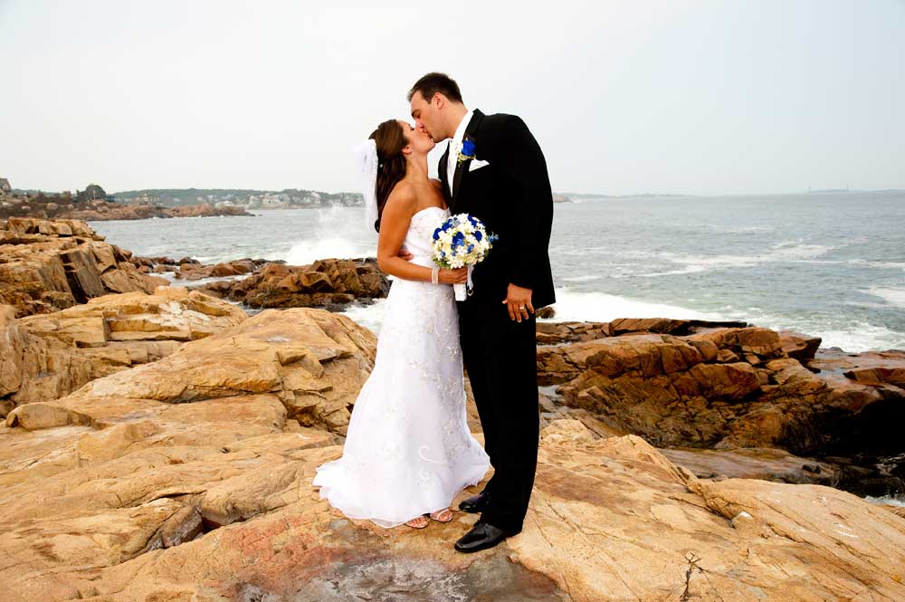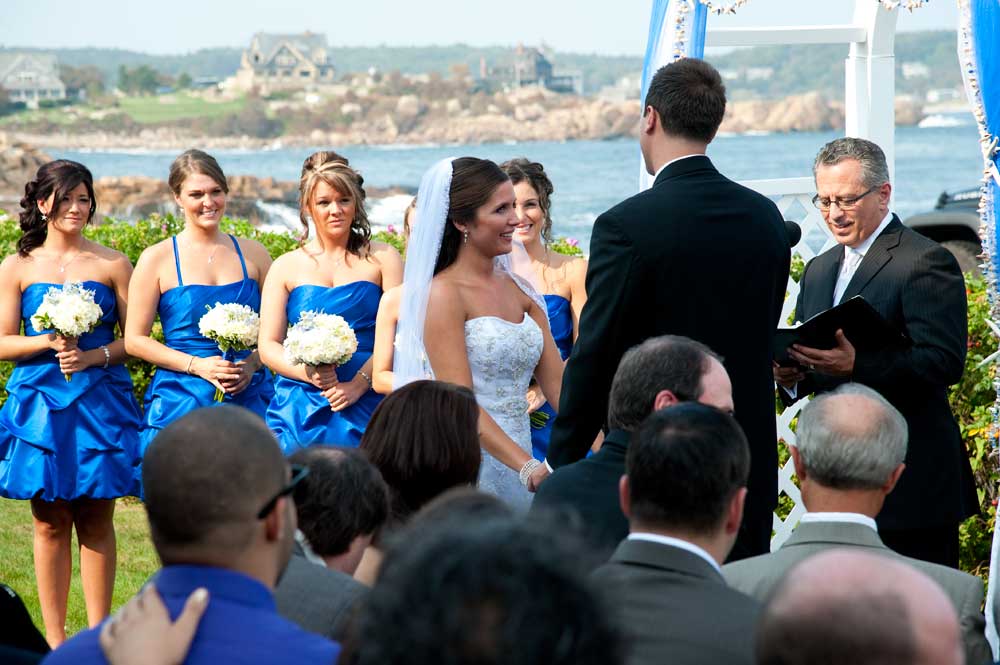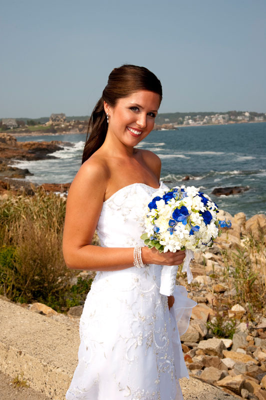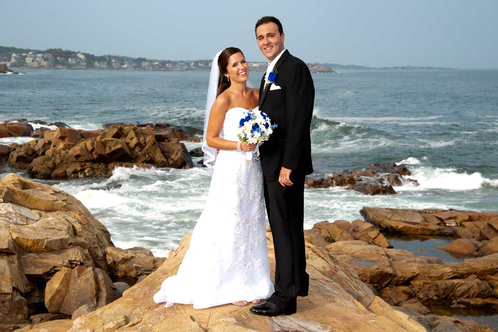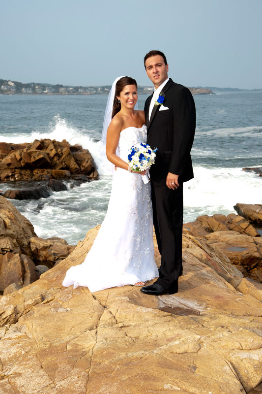 Another bright, sunny day (what a great summer this has been)! Exactly what was needed for formals on the rocks, with crashing waves in the background! The prep, ceremony and reception were all at the Elks at Bass Rocks, and the cooperation of the weather allowed an outdoor ceremony and outdoor formals. I can't resist showing the photos out of order: