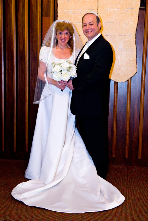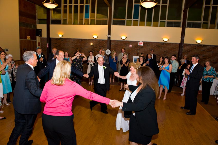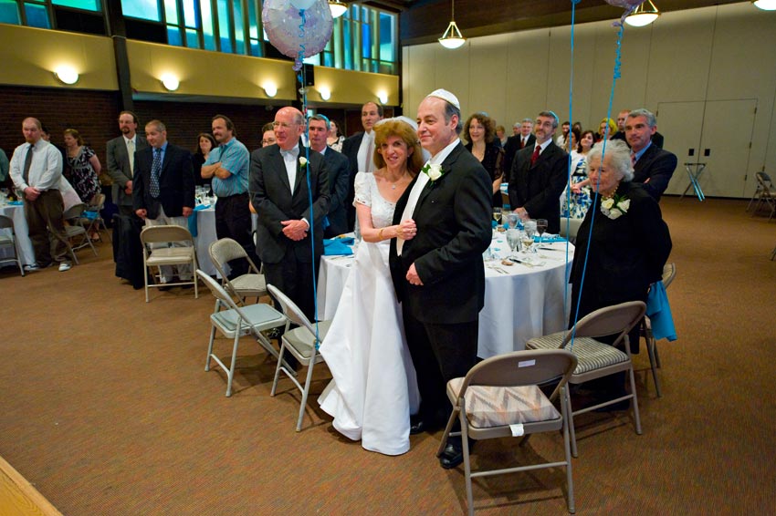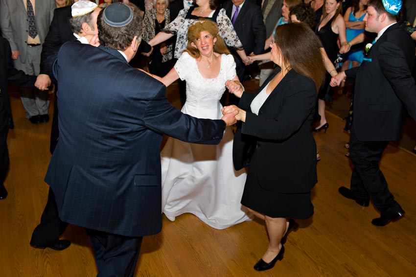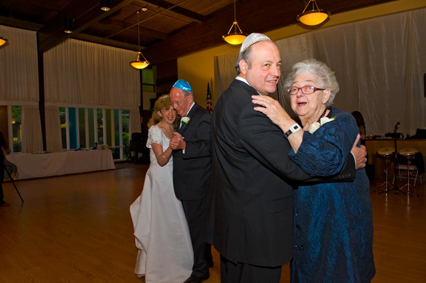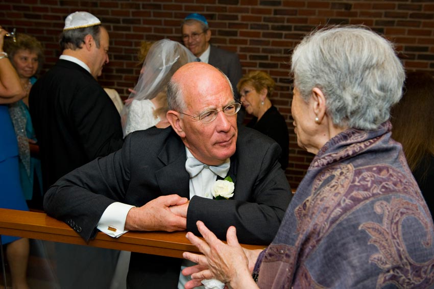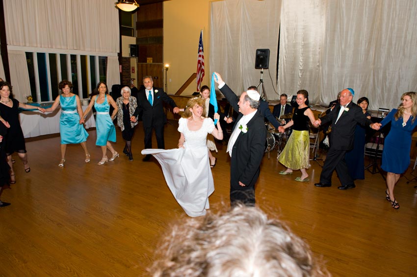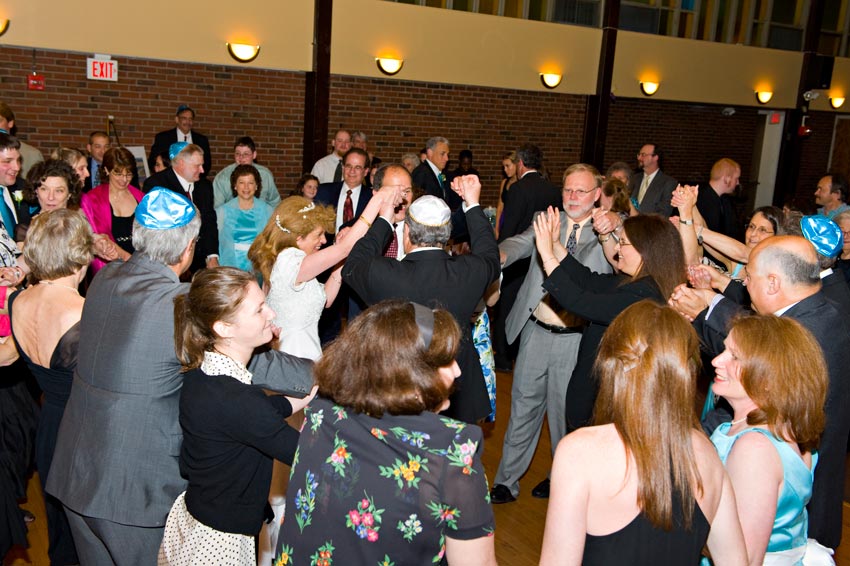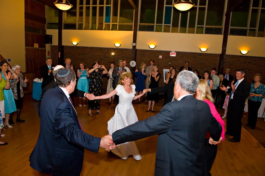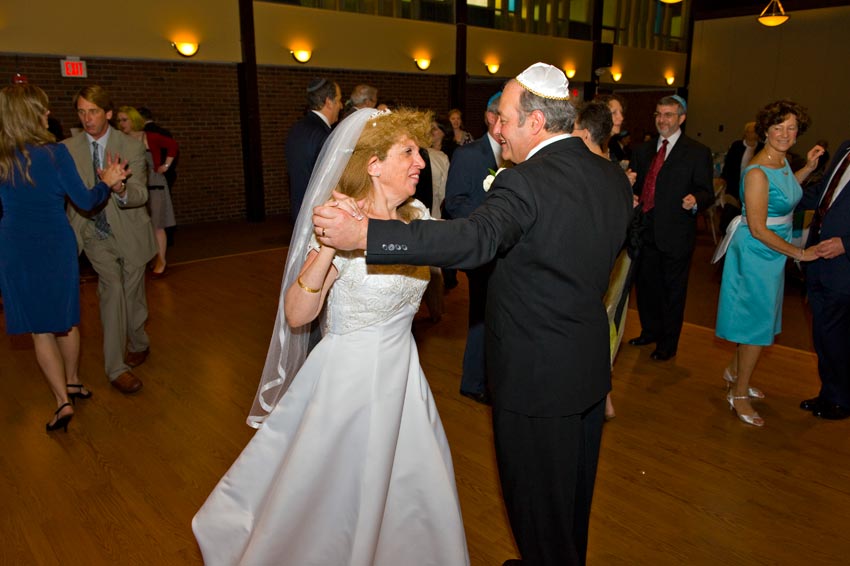 Temple Reyim, in Newton, was the site for everything. Bridal preparation, pre-ceremony meeting of bride and groom, Ketubah signing, Bedecken, and Yichud were all done in a small white room with mirrors all around --- plenty of light, so I could photograph without using a flash. Ceremony under the Chuppah, then the reception. Great dancing, and no one fell off the chairs! Everyone had lots of fun!