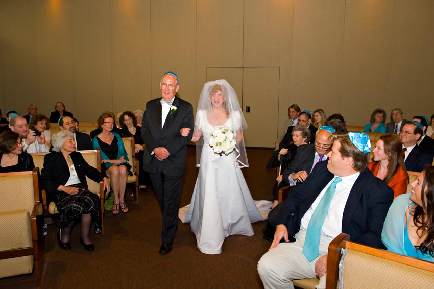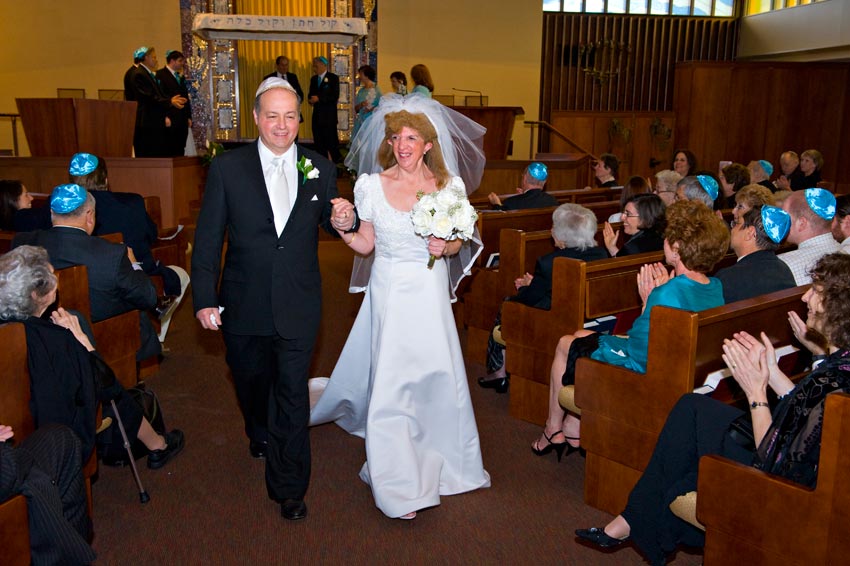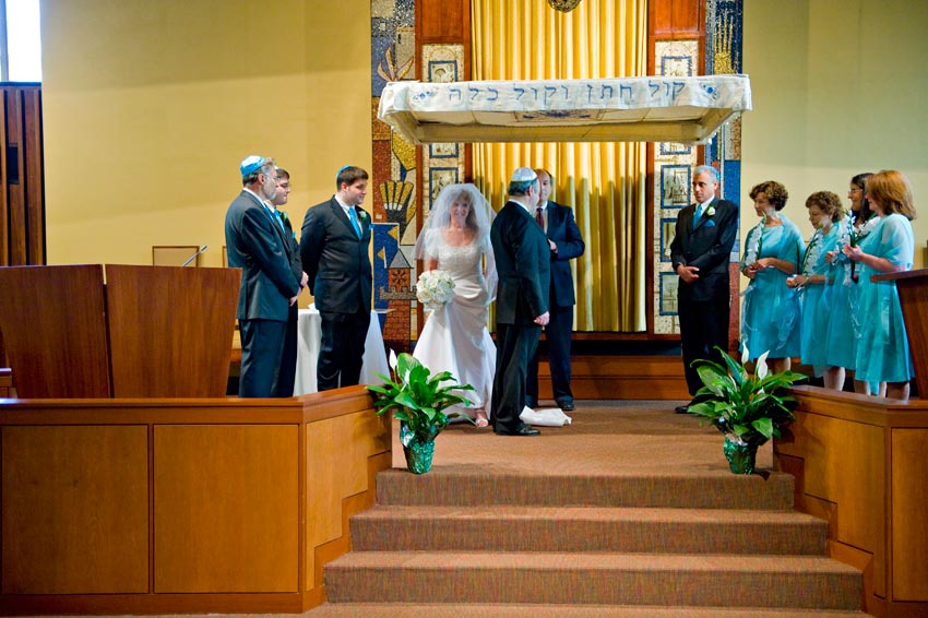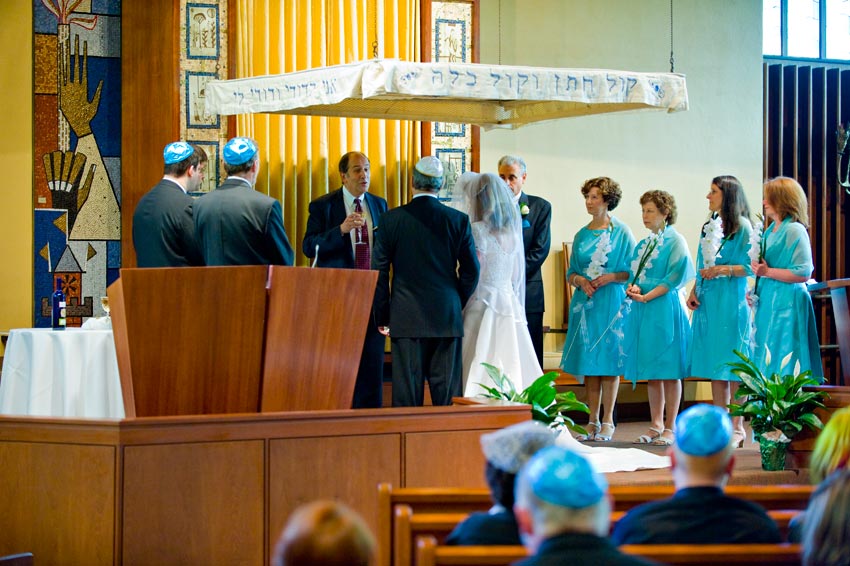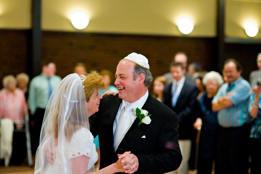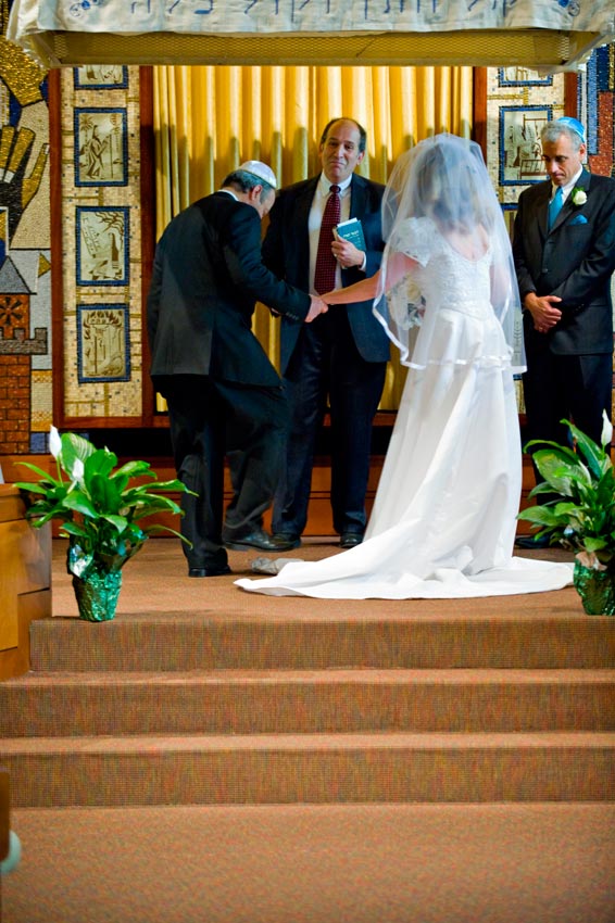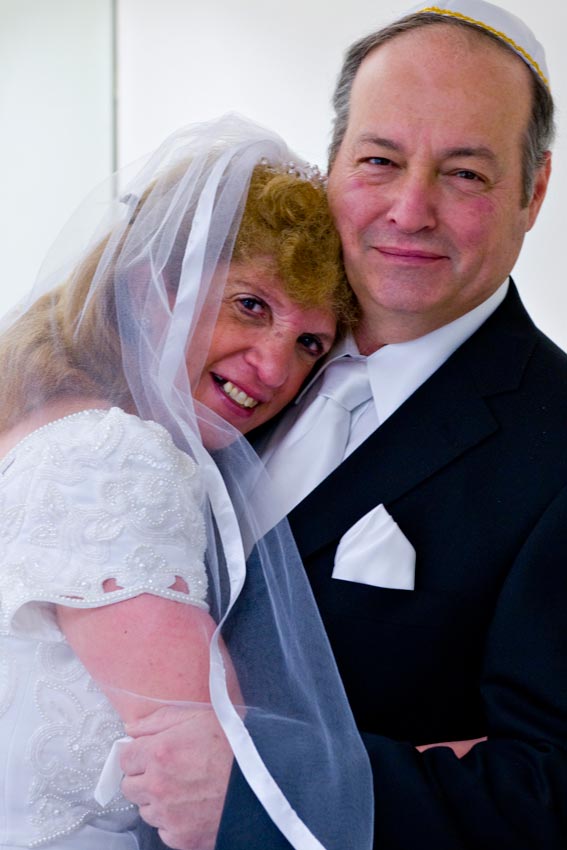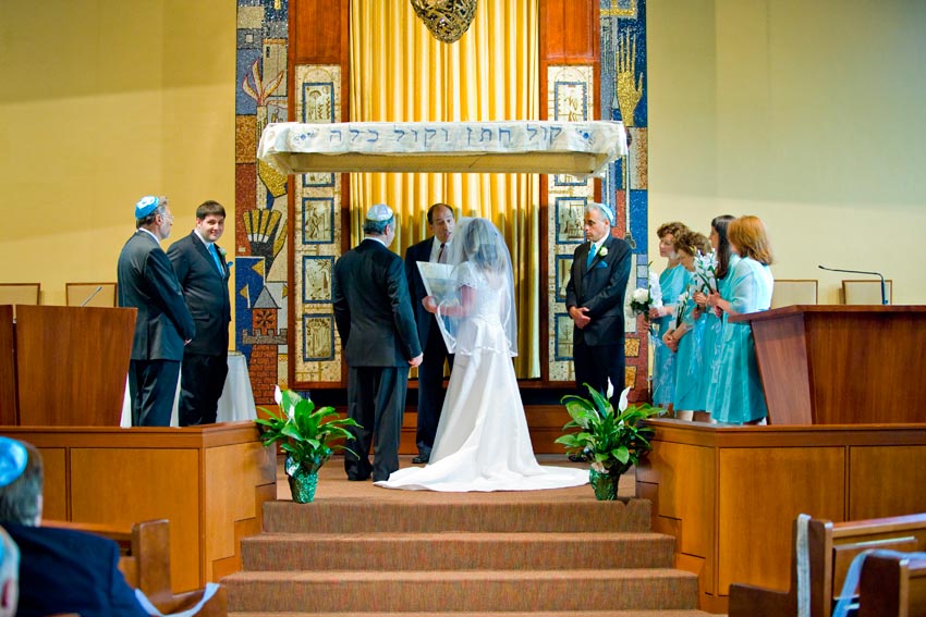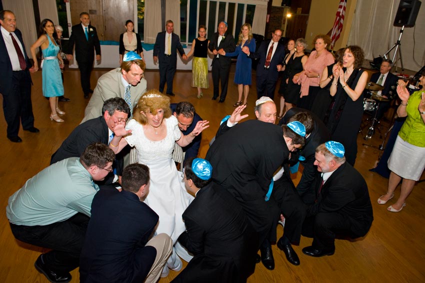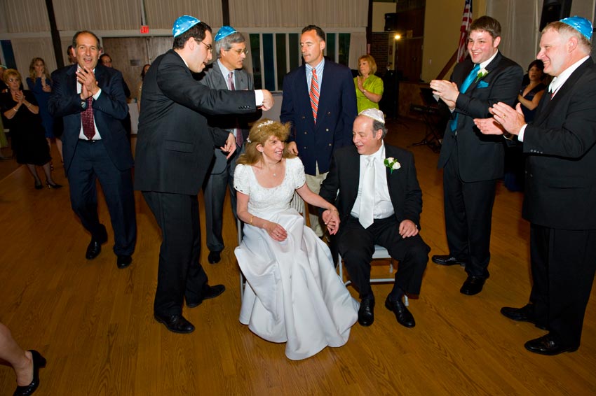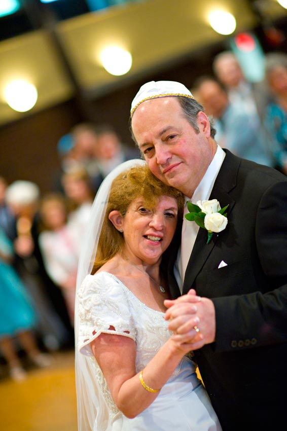 Temple Reyim, in Newton, was the site for everything. Bridal preparation, pre-ceremony meeting of bride and groom, Ketubah signing, Bedecken, and Yichud were all done in a small white room with mirrors all around --- plenty of light, so I could photograph without using a flash. Ceremony under the Chuppah, then the reception. Great dancing, and no one fell off the chairs! Everyone had lots of fun!