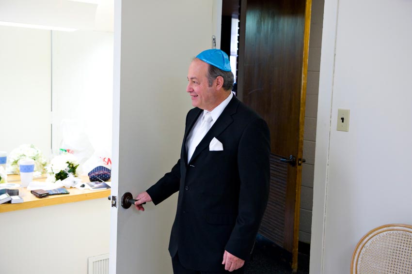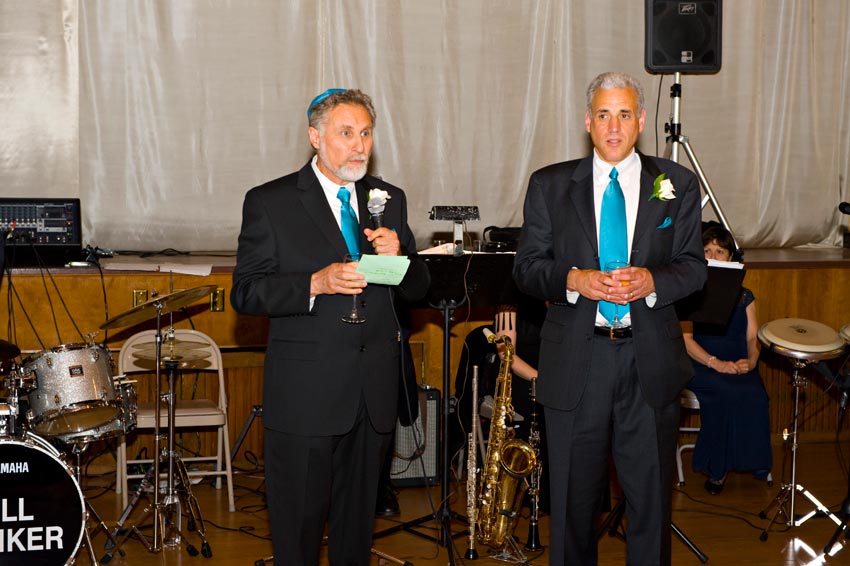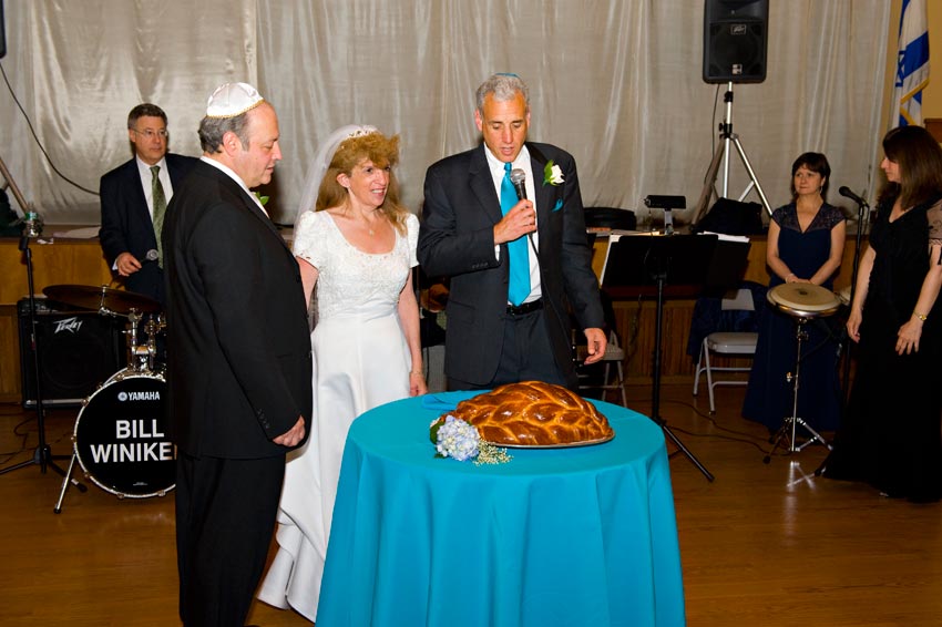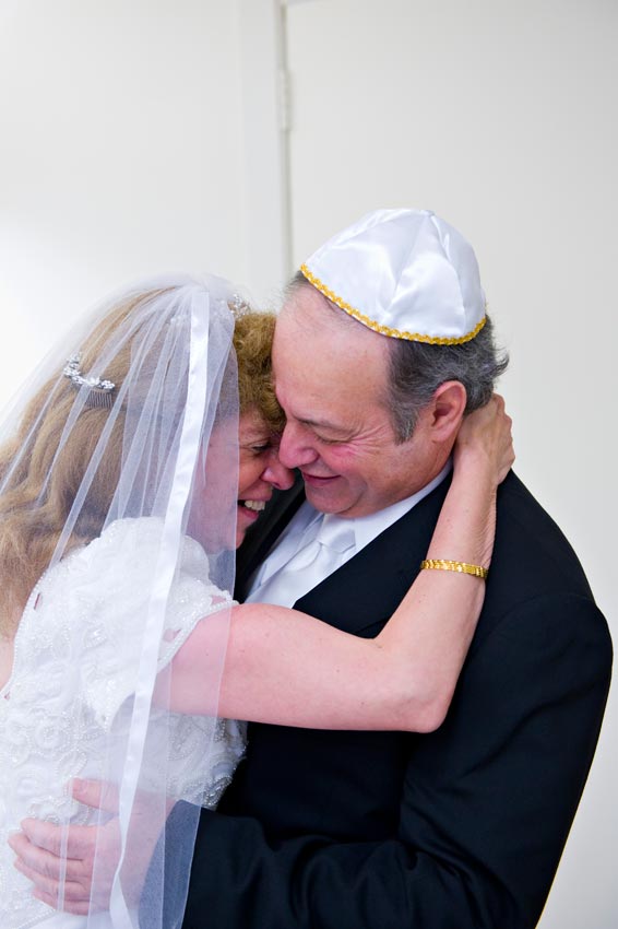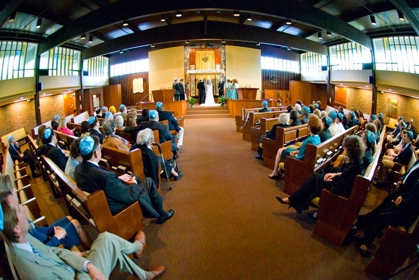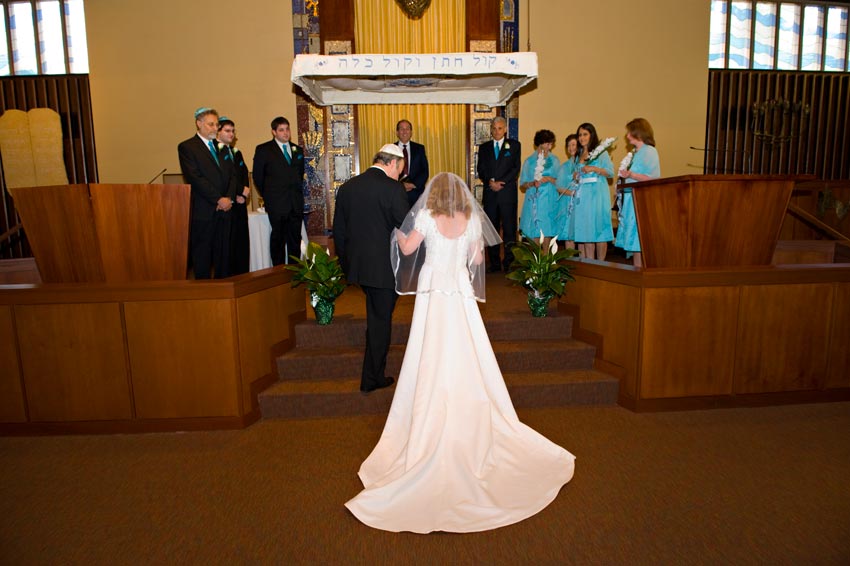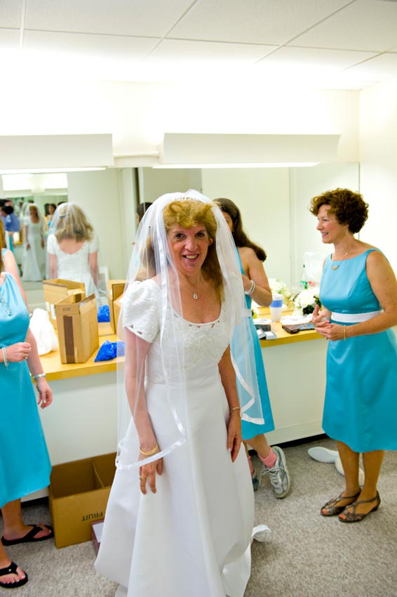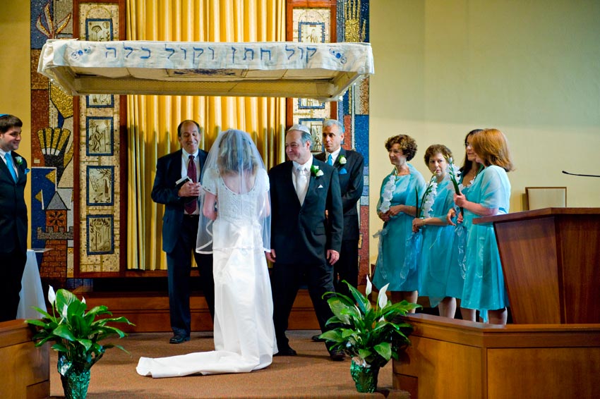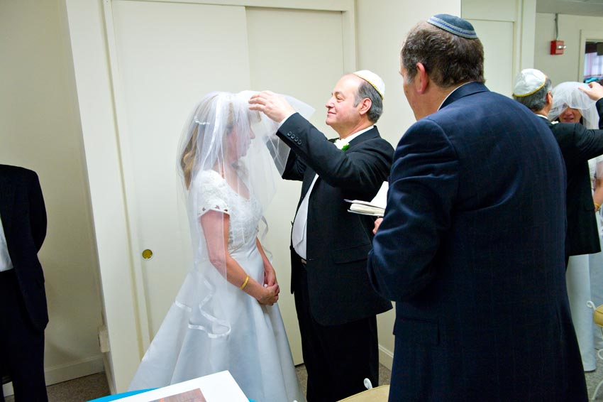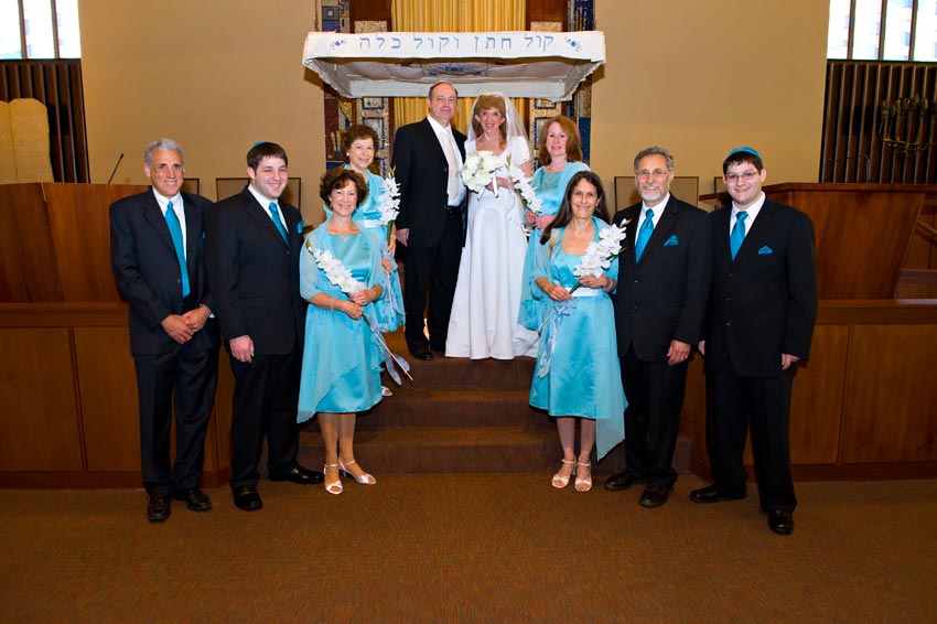 Temple Reyim, in Newton, was the site for everything. Bridal preparation, pre-ceremony meeting of bride and groom, Ketubah signing, Bedecken, and Yichud were all done in a small white room with mirrors all around --- plenty of light, so I could photograph without using a flash. Ceremony under the Chuppah, then the reception. Great dancing, and no one fell off the chairs! Everyone had lots of fun!