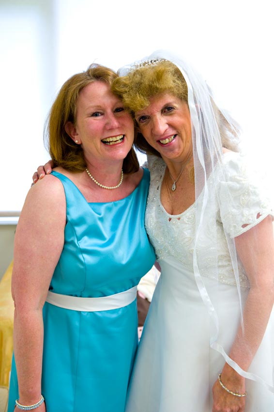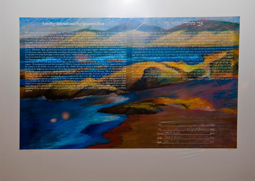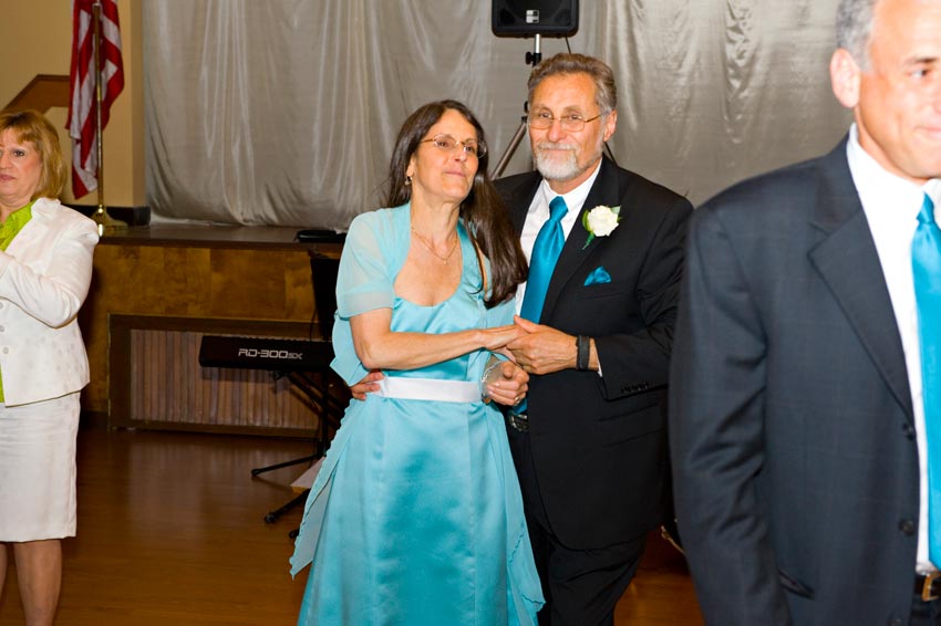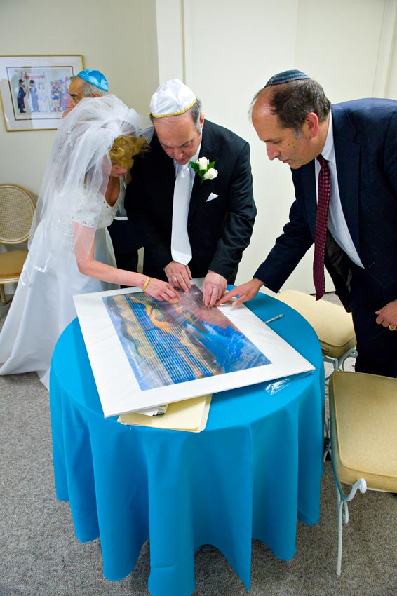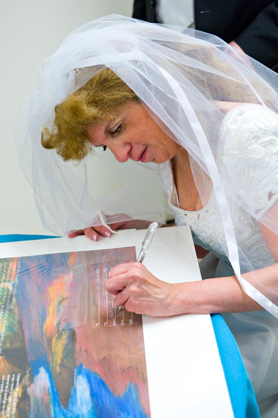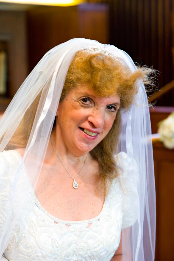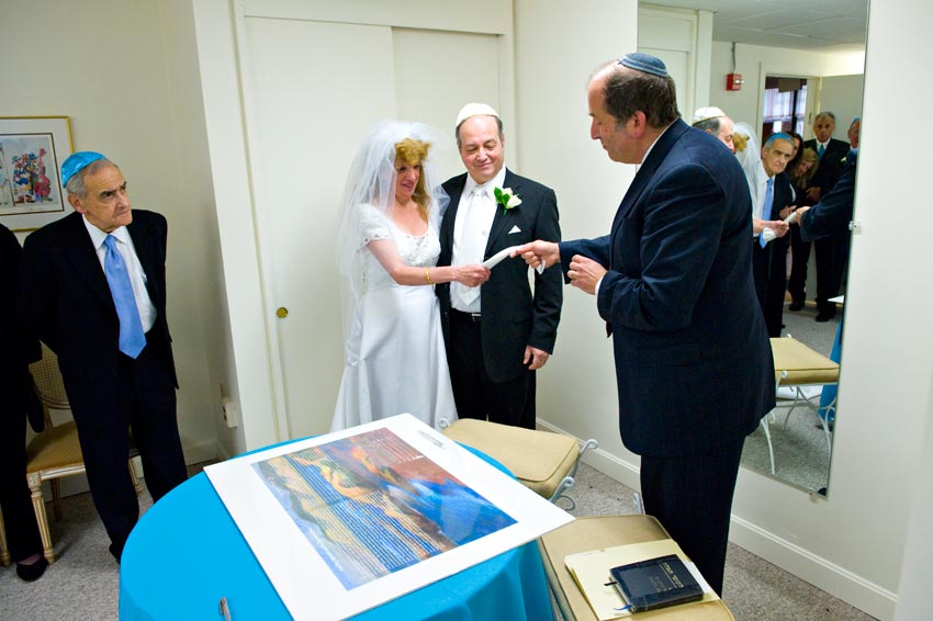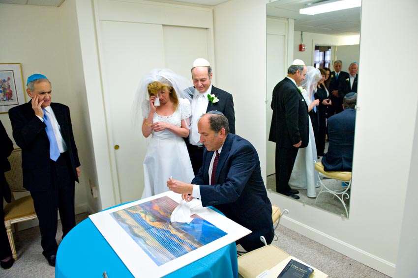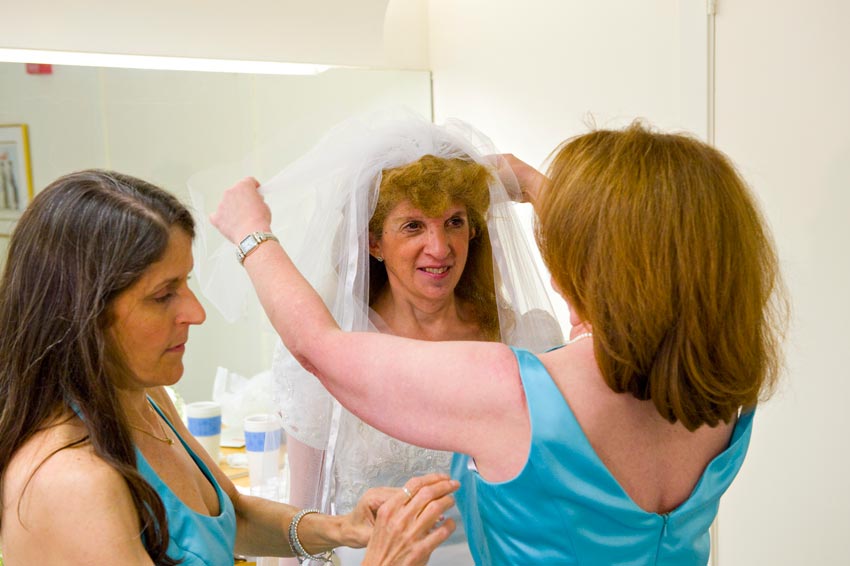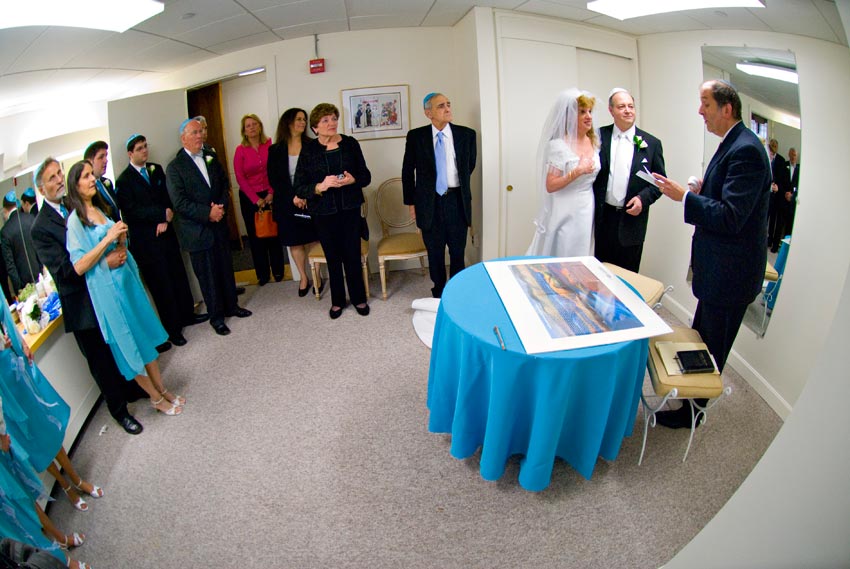 Temple Reyim, in Newton, was the site for everything. Bridal preparation, pre-ceremony meeting of bride and groom, Ketubah signing, Bedecken, and Yichud were all done in a small white room with mirrors all around --- plenty of light, so I could photograph without using a flash. Ceremony under the Chuppah, then the reception. Great dancing, and no one fell off the chairs! Everyone had lots of fun!